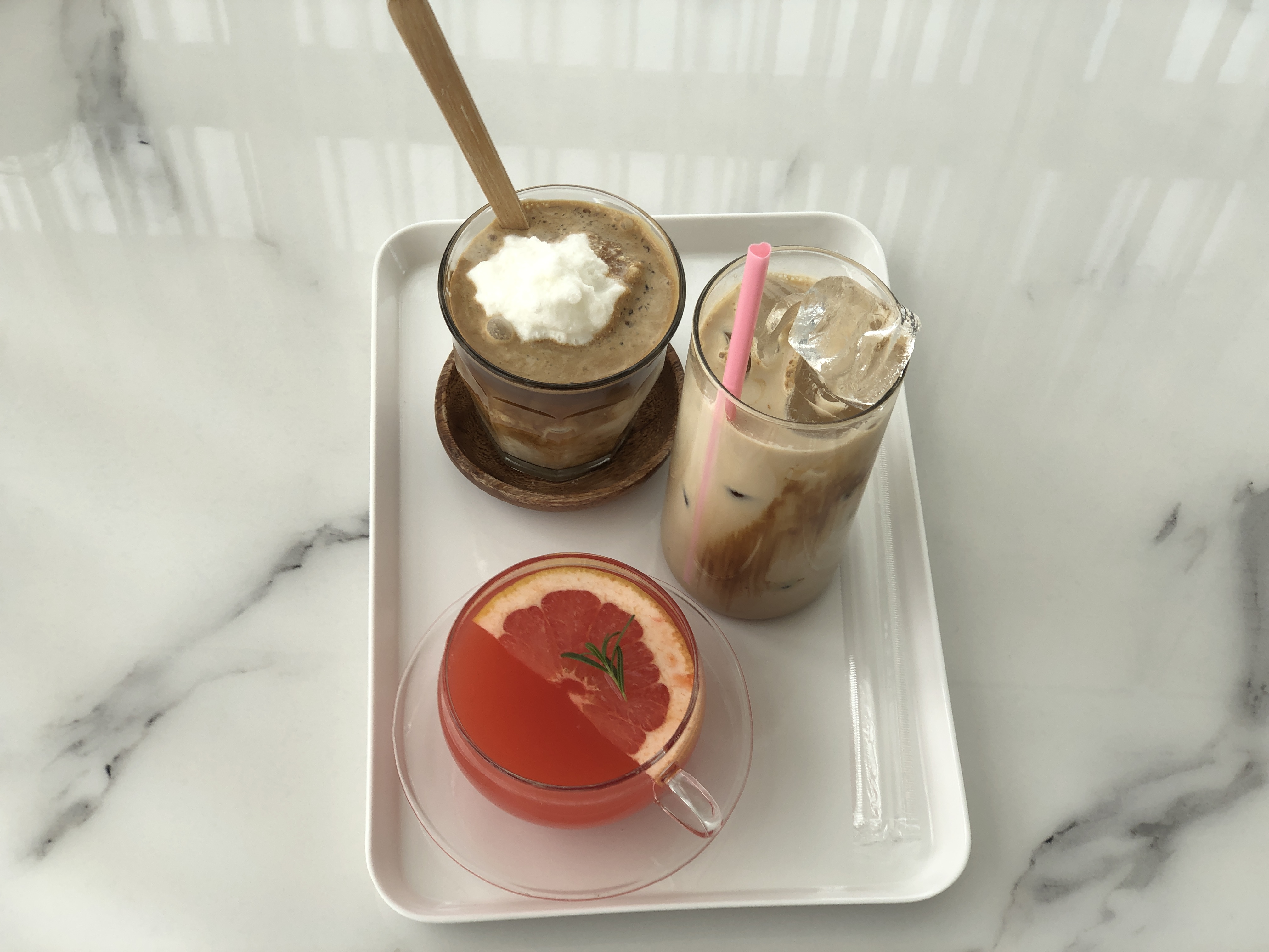 코코넛 커피 스무디와 바닐라 라떼와 자몽차.