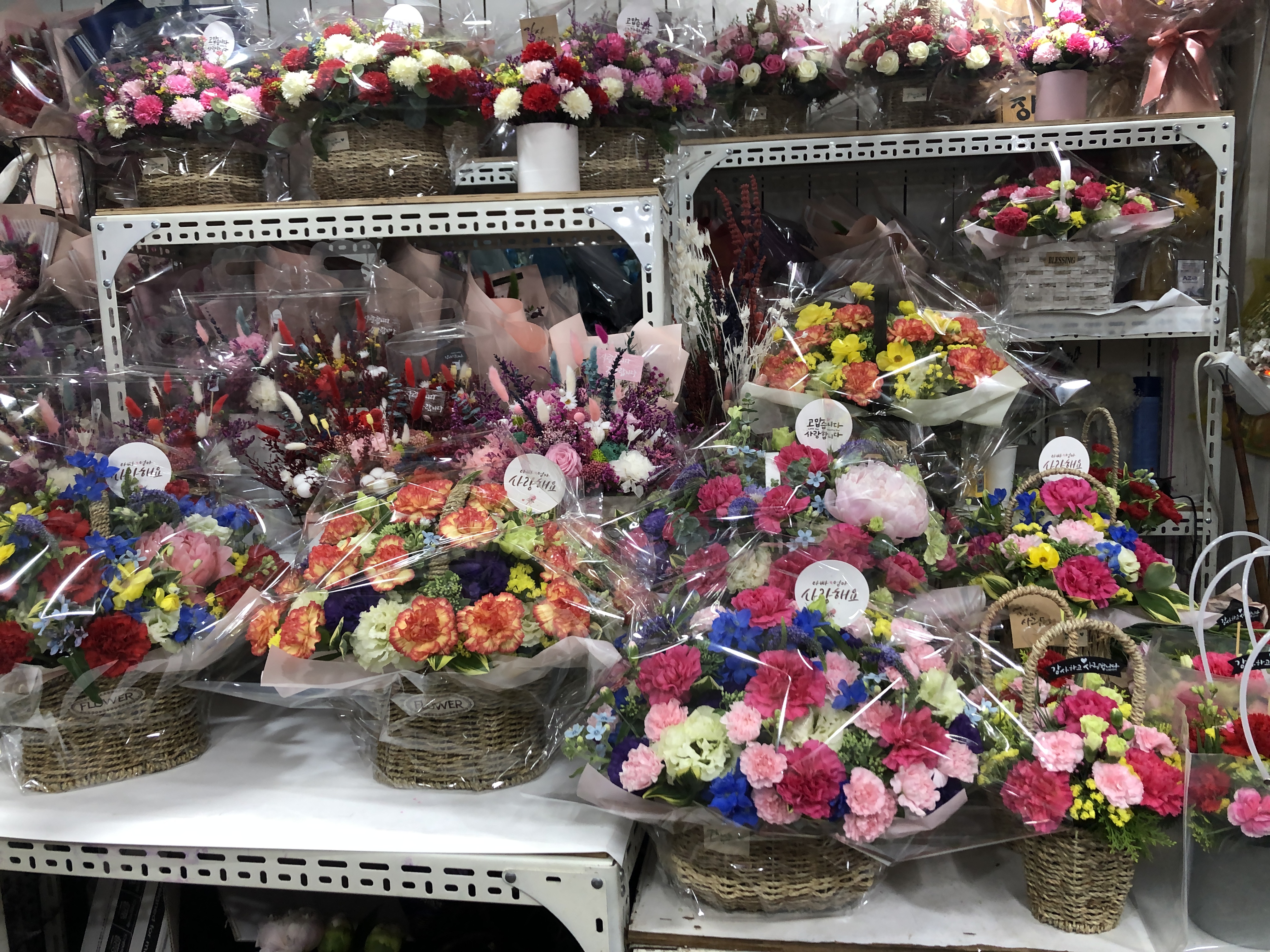 이 꽃집은 유난히 사람이 많았다. 저렇게 바구니 만들어두고 비닐주머니에 담아주셔서 들고 가기 편해 보였다. 가격도 1만 원이라 매우 합리적...! #남대문꽃시장카네이션가격