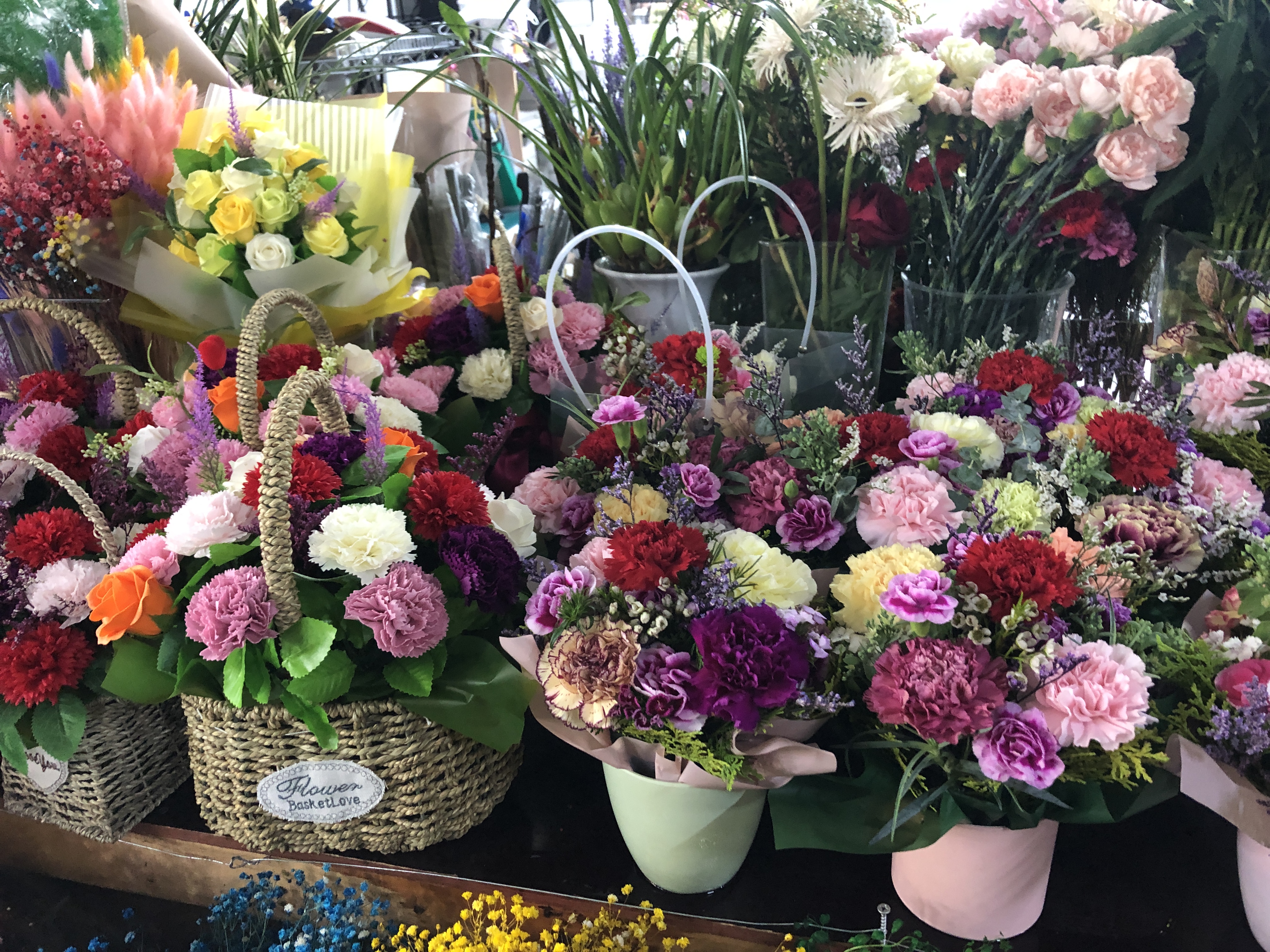 예쁘게 카네이션 꽃바구니 만들어놓은 것도 눈에 많이 띄었다. 작은 것은 1만 원부터 시작했다. 꽃꽂이가 조화롭고 생화라 향기도 좋고 너무 예뻤다. 원하는 카네이션을 고르면 바로 바구니로 만들어주시기도 한다.