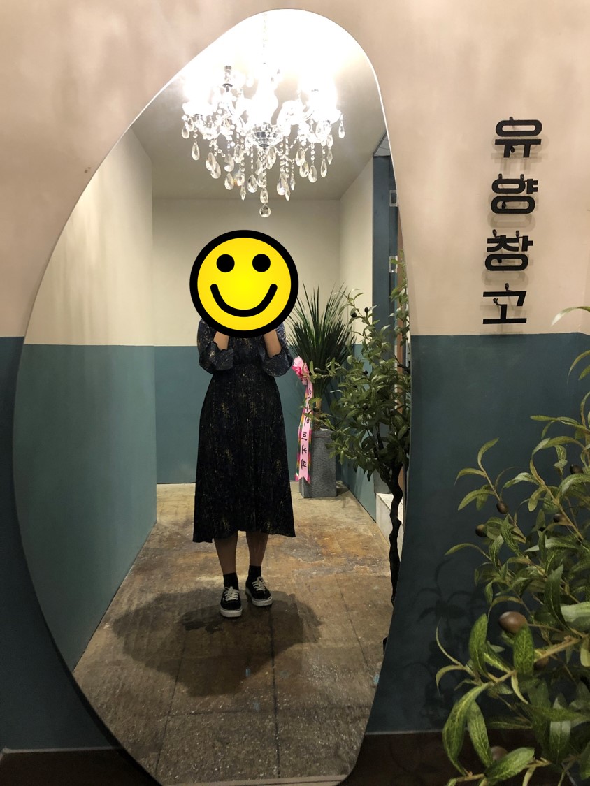 화장실 가는 길에 거울 포토존이 있다. 멋진 샹들리에 조명과 금귤 나무가 인상적임. ㅎㅎ