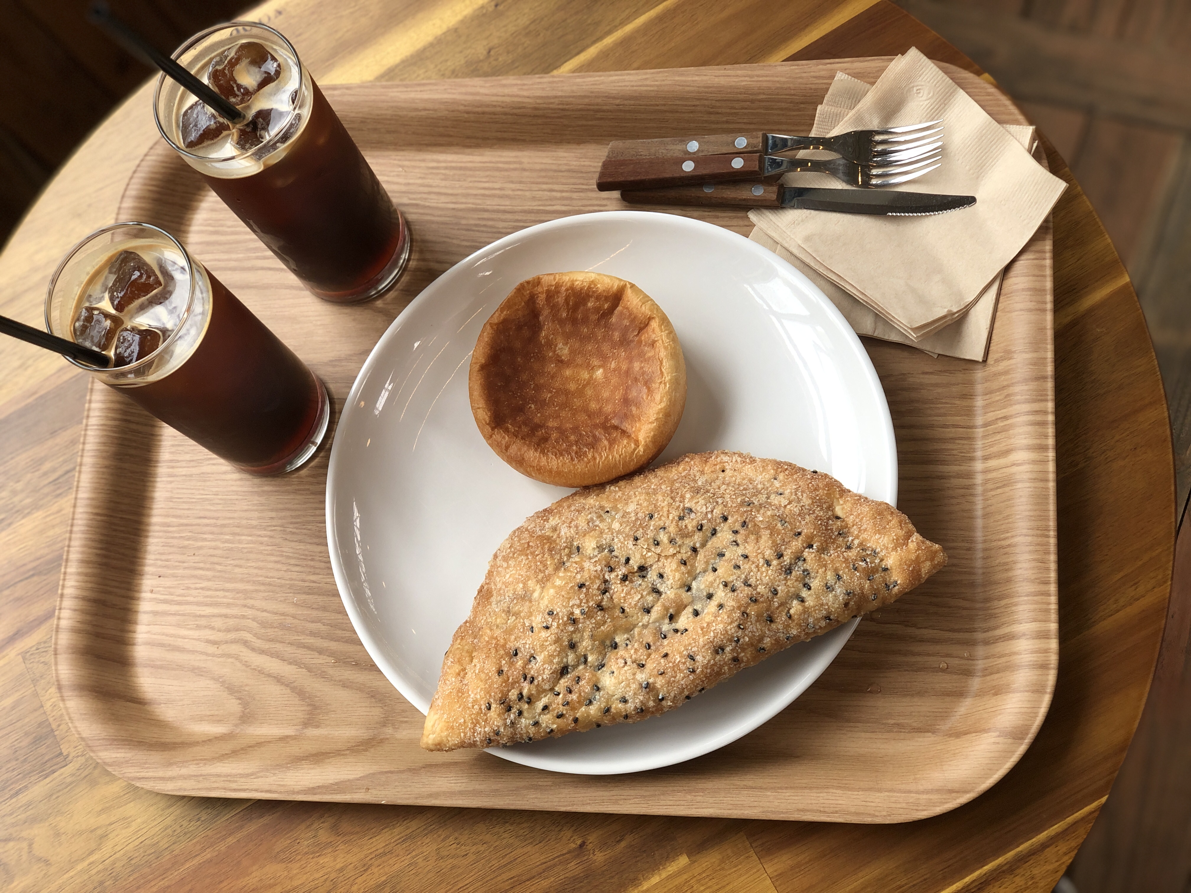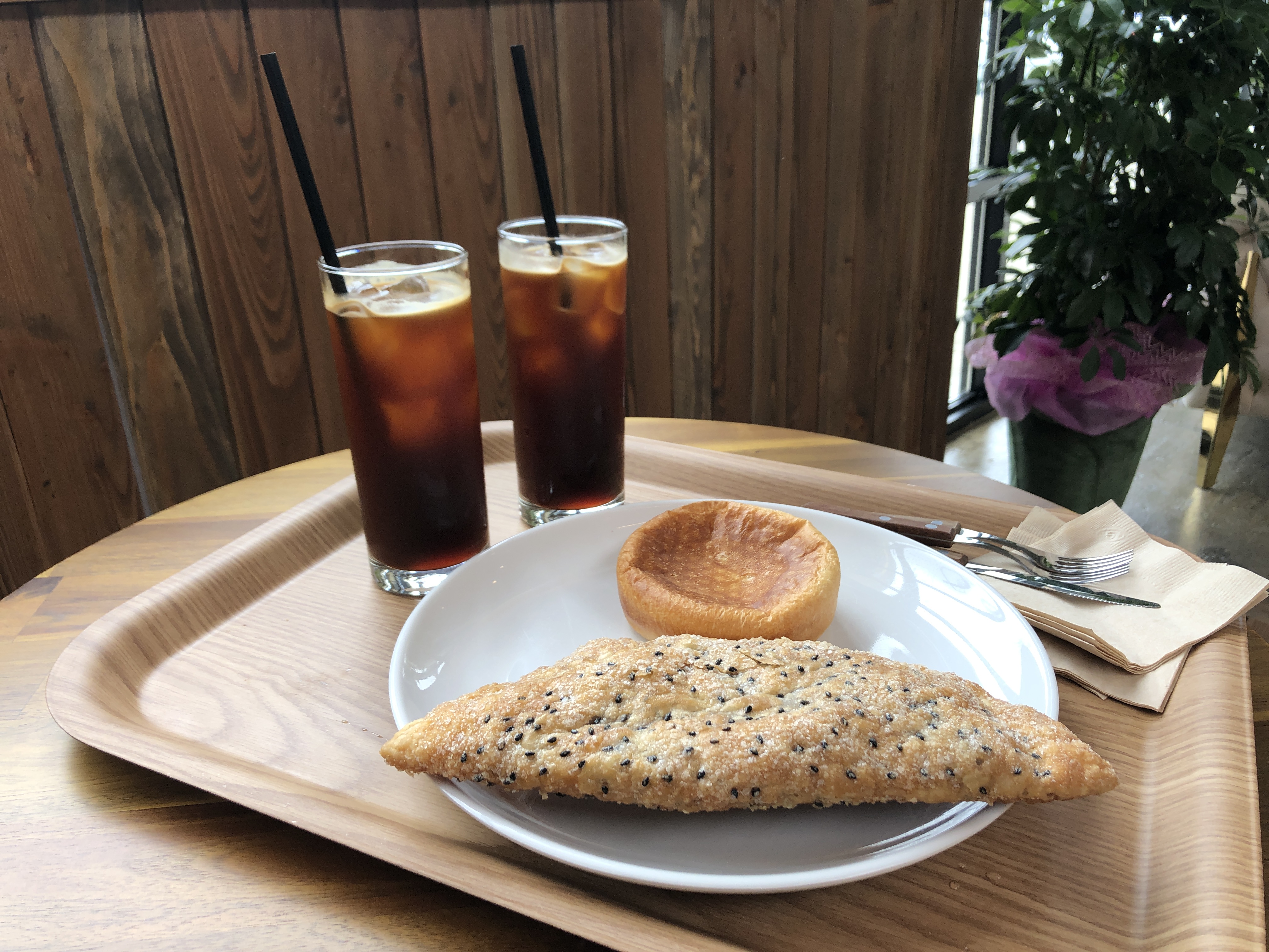커피와 빵이 나왔다. 우리는 아이스 아메리카노(5,000원) 2잔과 블루베리 파이(4,800원), 슈크림빵(2,000원)을 주문했다.