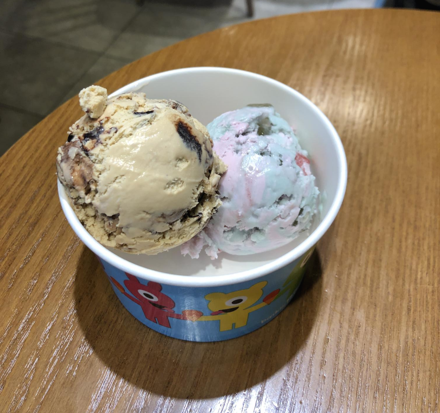 주문하고 30초도 안돼서 아이스크림이 준비되었다. 왼쪽이 '자모카 아몬드 훠지'이고 오른쪽이 '판타스틱 트롤'이다. 5월 이달의 맛인 '판타스틱 트롤'은 맛이 궁금해서 주문해보았다. 상큼한 체리 아이스크림과 키위 샤베트에 젤리가 들어간 제품이었다. 아이스크림은 상큼, 새콤, 달콤했음!