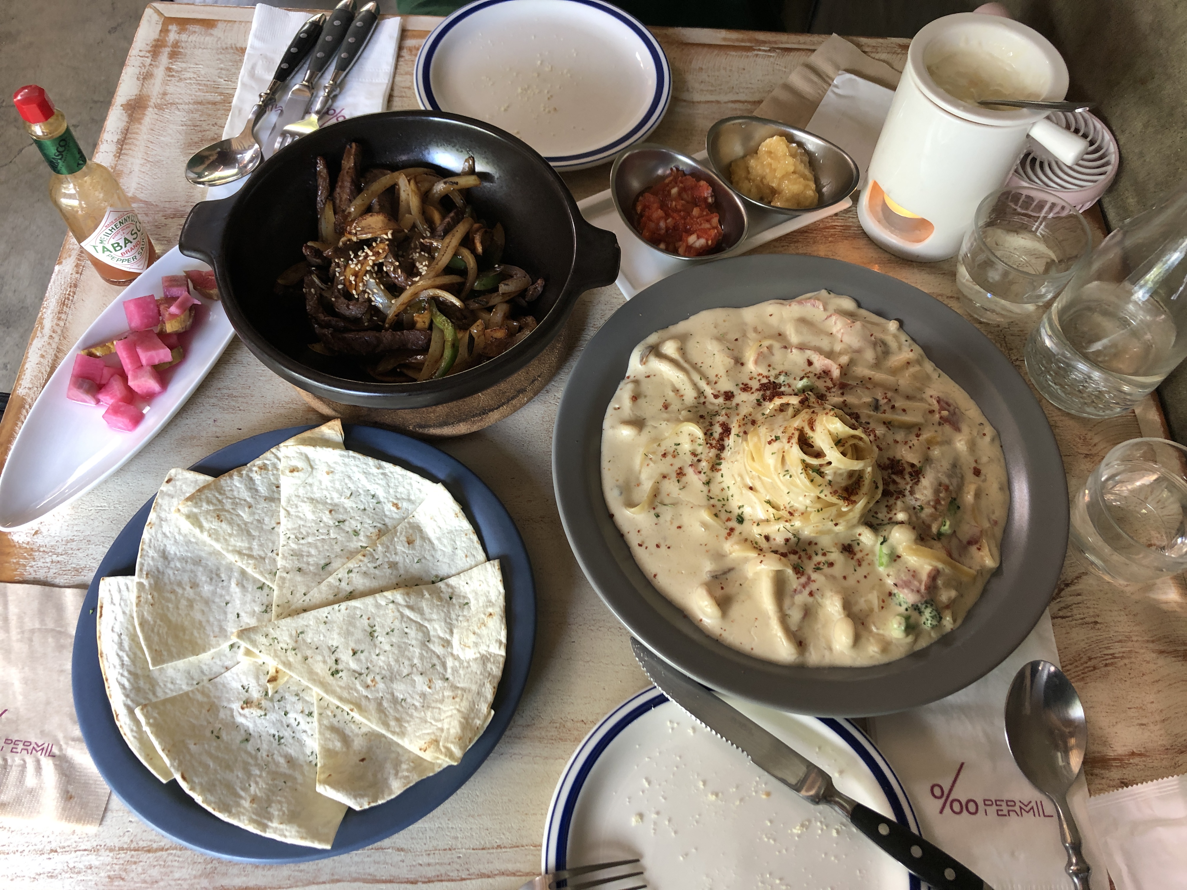 또띠아에 소고기 볶음을 싸서 같이 나오는 갈릭소스, 칠리소스, 치즈와 같이 곁들여 먹으면 된다. 소고기 볶음은 정말 맛있고 갈릭 소스도 입에 잘 맞았지만 피자를 먹고 싶었던 우리에게는 조금 당황스럽고 신선한 메뉴였다. 가격도 피자 중에 젤 비쌌는데... 뭔가 아쉬움... 그래도 맛있어서 매우 잘 먹었다... ^^