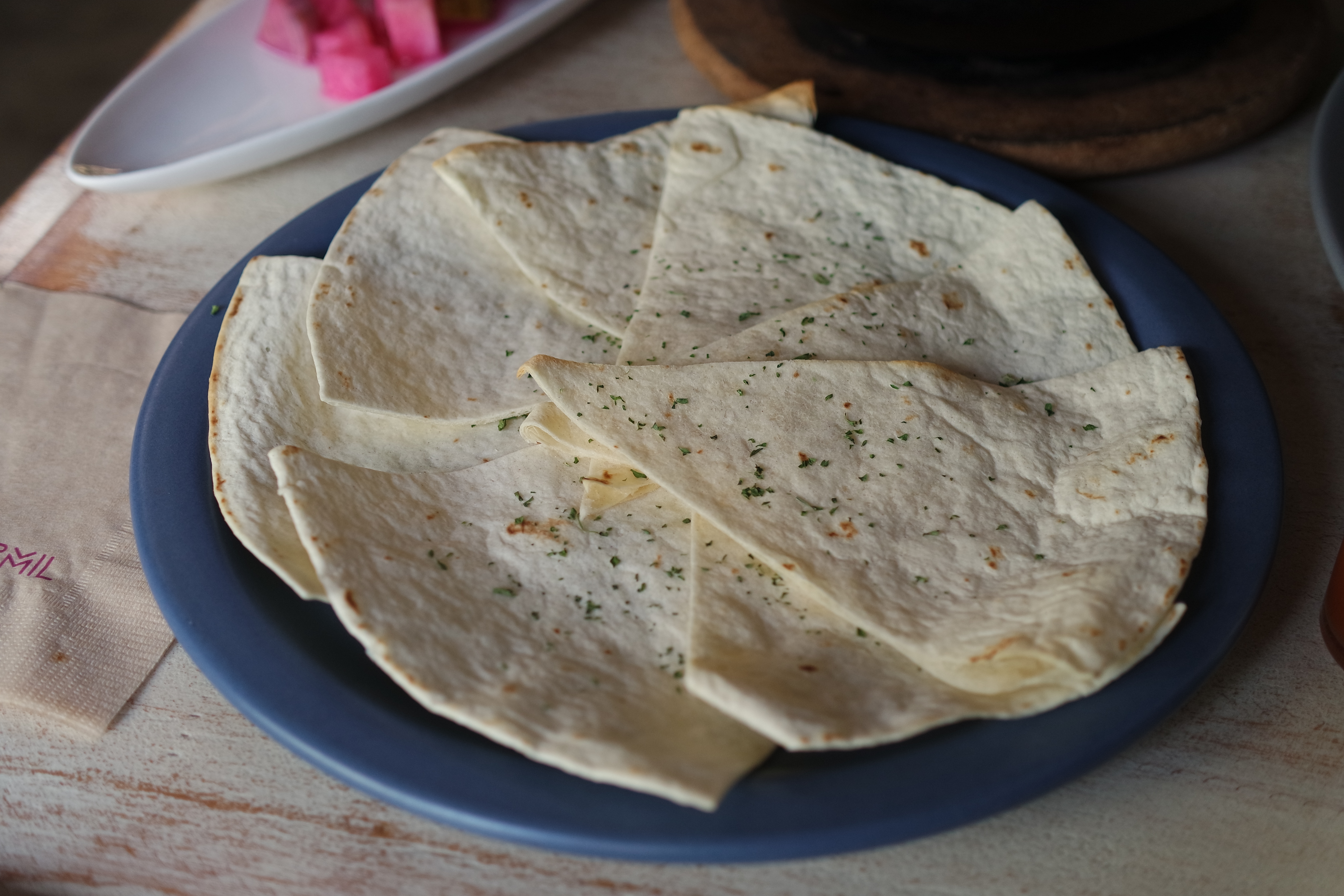 다음은 피자. 우리가 주문한 피자의 정식 명칭은 '직접 싸서 먹는 만조 피자'였다. 만조는 이탈리아어로 소고기를 뜻한다고 한다. 싸 먹는 피로 또띠아가 준비되었고 소고기 볶음 같은 게 따로 나왔다.