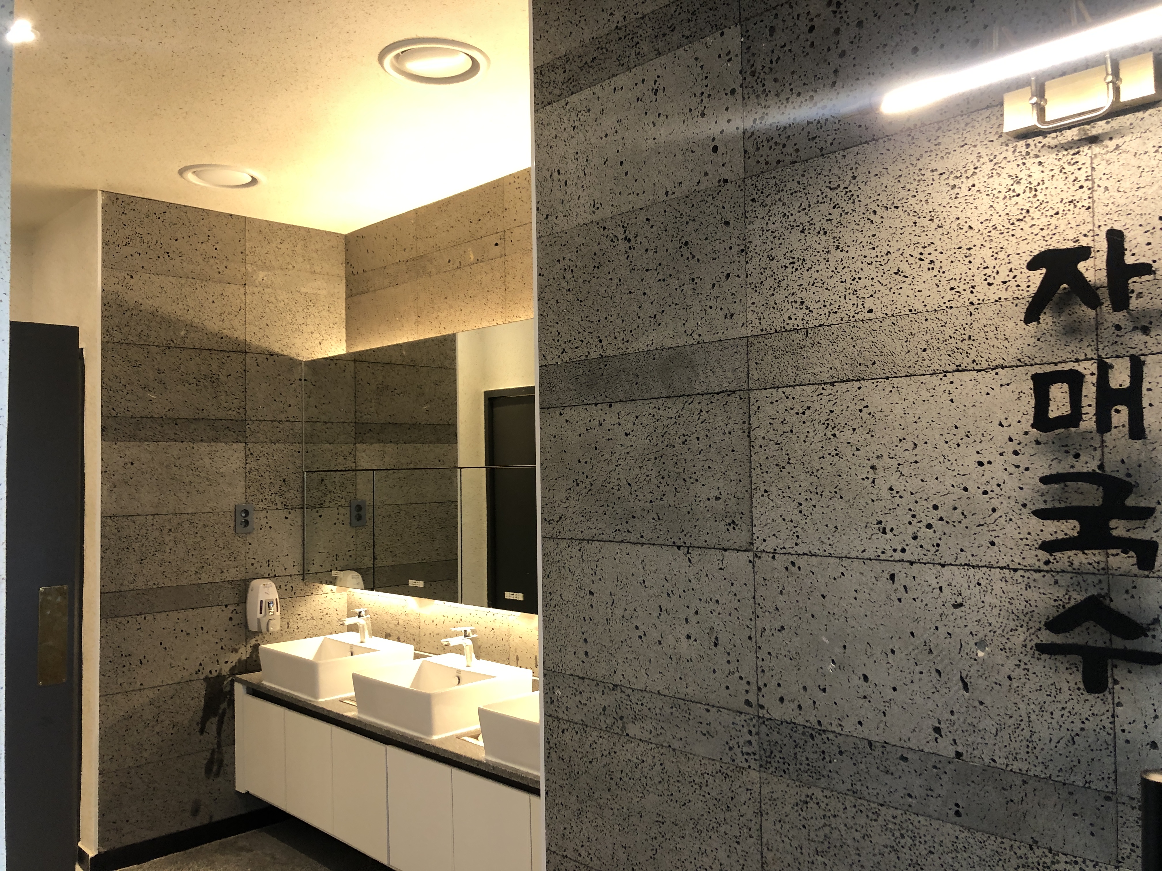 카운터가 참 예뻤다. 돌담을 연상시키는 카운터, 우드 계열 벽면과 잘 어울렸다. 카운터 맞은편에 대기할 수 있는 공간도 마련되어 있고 여기에 커피 자판기도 있다. #제주도고기국수 #제주도토속음식점