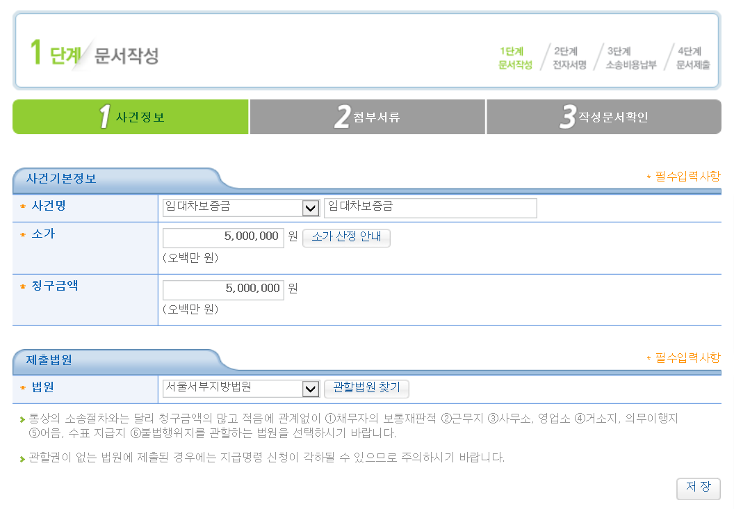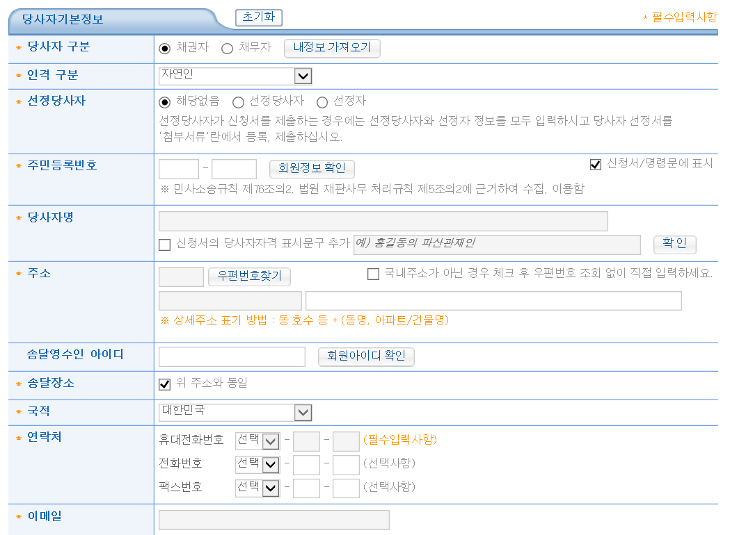 - 주소 : 내 거주지 입력. (나는 이 주소지를 기준으로 관할 법원 지정함)