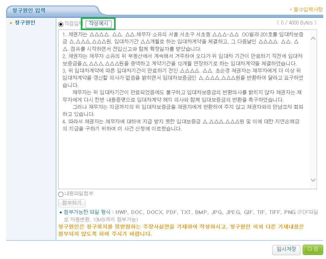 청구취지 입력란은 친절하게도 작성 예시가 있어서 그것을 참고하면 된다. 나같은 경우는 작성 예시 [민사 채무] 내용을 가져와서 수정했다.