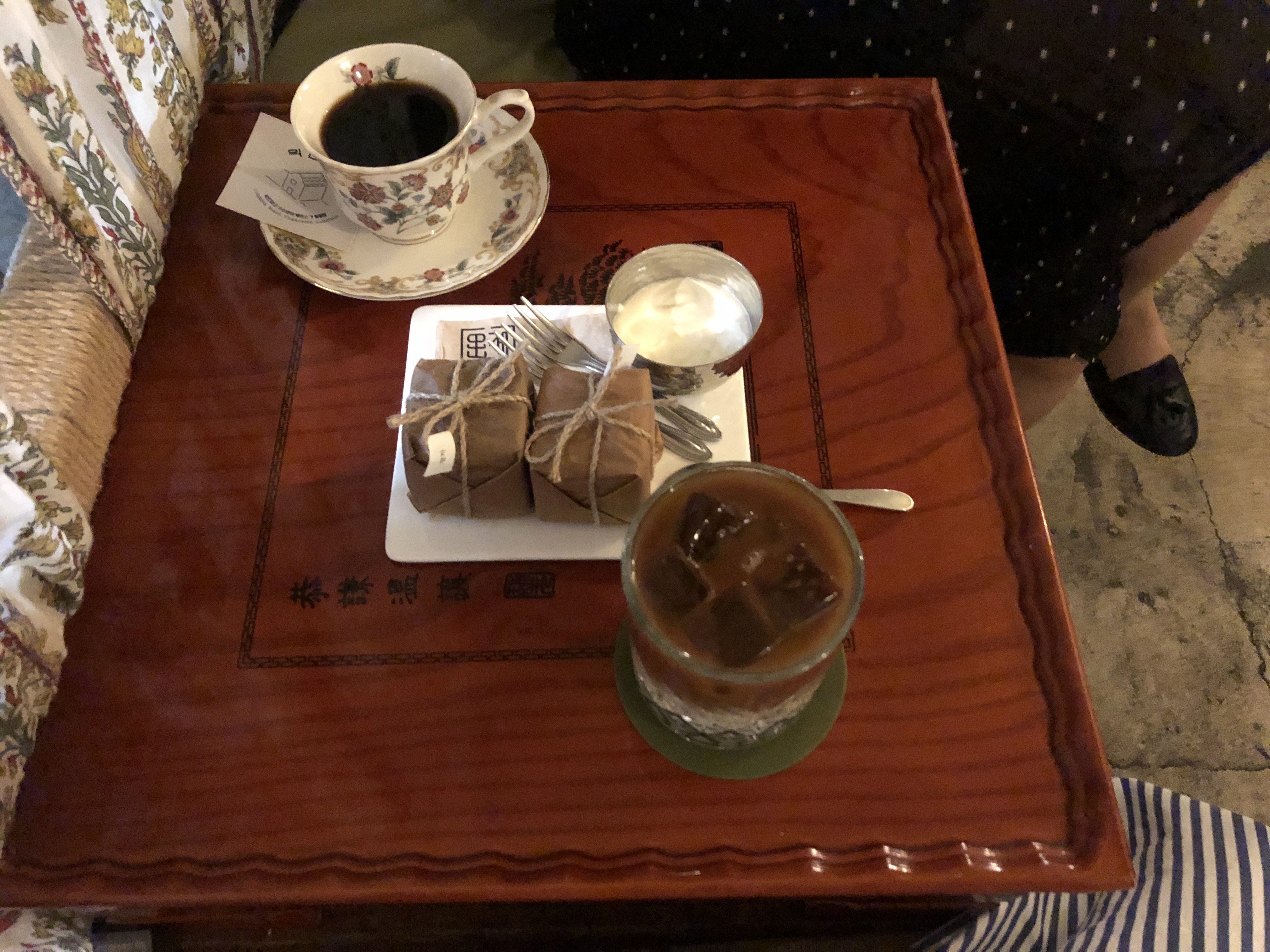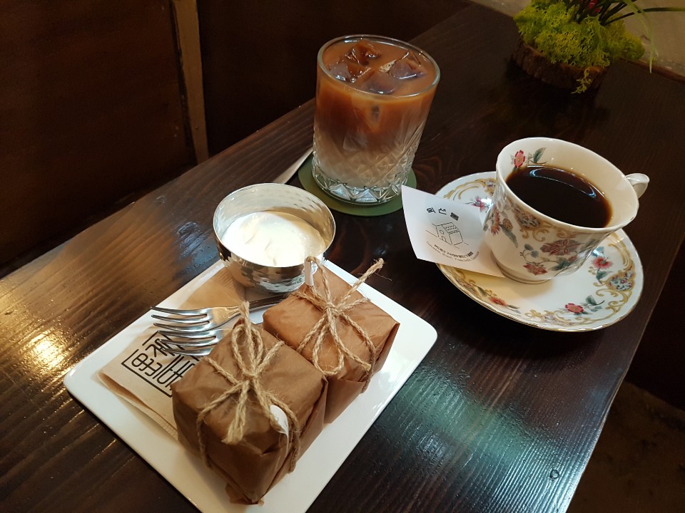 인테리어 구경을 하다 보니 음료가 준비되었다. 우리가 주문한 메뉴는 드립 커피 - 익선동, 폴 고갱, 네모 치즈케이크 딸기와 녹차였다. 동그란 그릇에 하얀 것은 네모 치즈케이크 녹차에 발라먹으라고 하셨다. 생크림을 약간 휘핑한 듯 걸쭉했다.