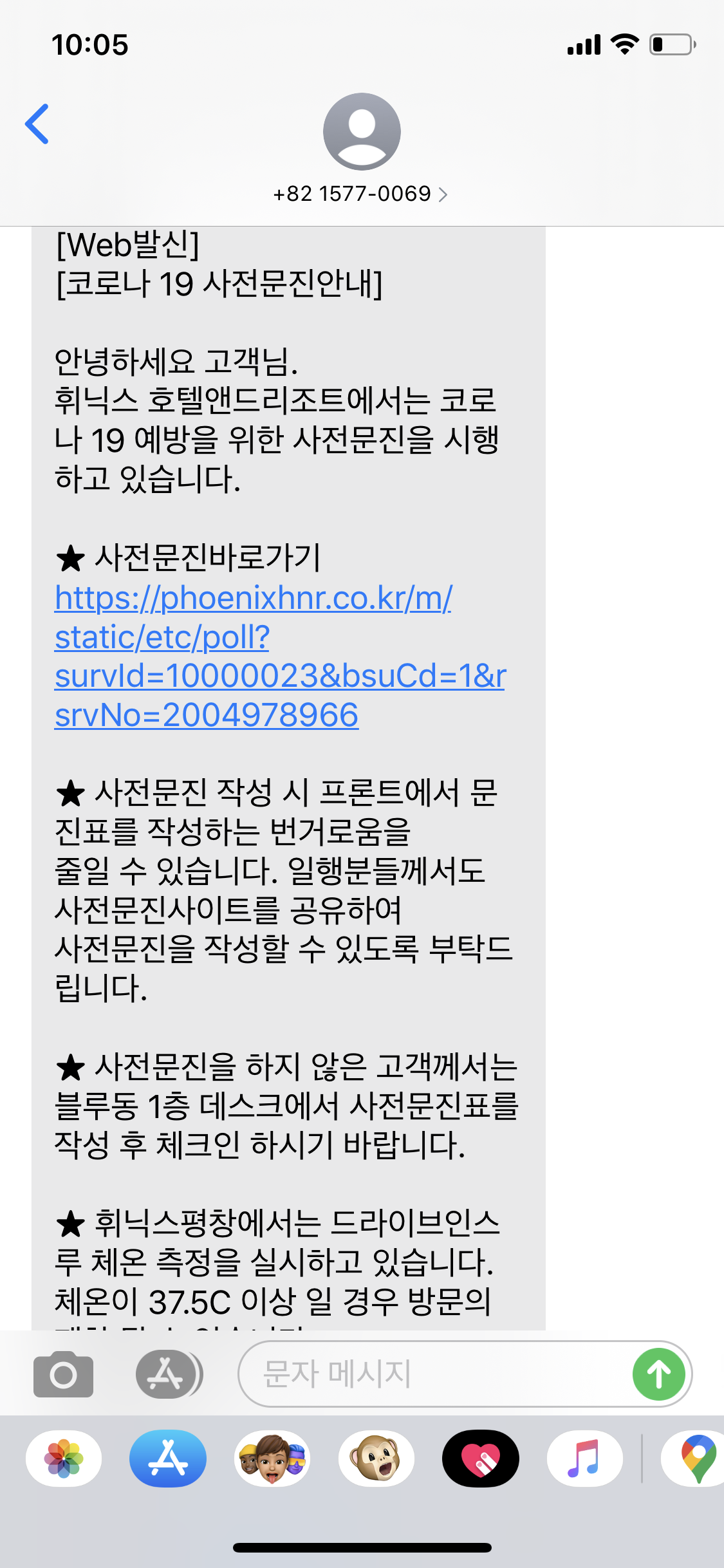 체크인을 하기 위해 평창 휘닉스파크 리조트 블루동 앞에 잠시 정차를 했다. 블루동 입구는 체크인을 위해서 잠시 정차하는 것을 허용해준다. 우리는 오후 5시쯤 체크인을 했는데 대기 인원이 없어서 바로 체크인을 할 수 있었다. 그리고 체크인 당일 아침에 코로나 19 사전 문진 시행 문자가 왔다. 사전 문진을 작성하면 체크인 시 프런트에서 문진표를 작성하는 번거로움을 줄일 수 있다.