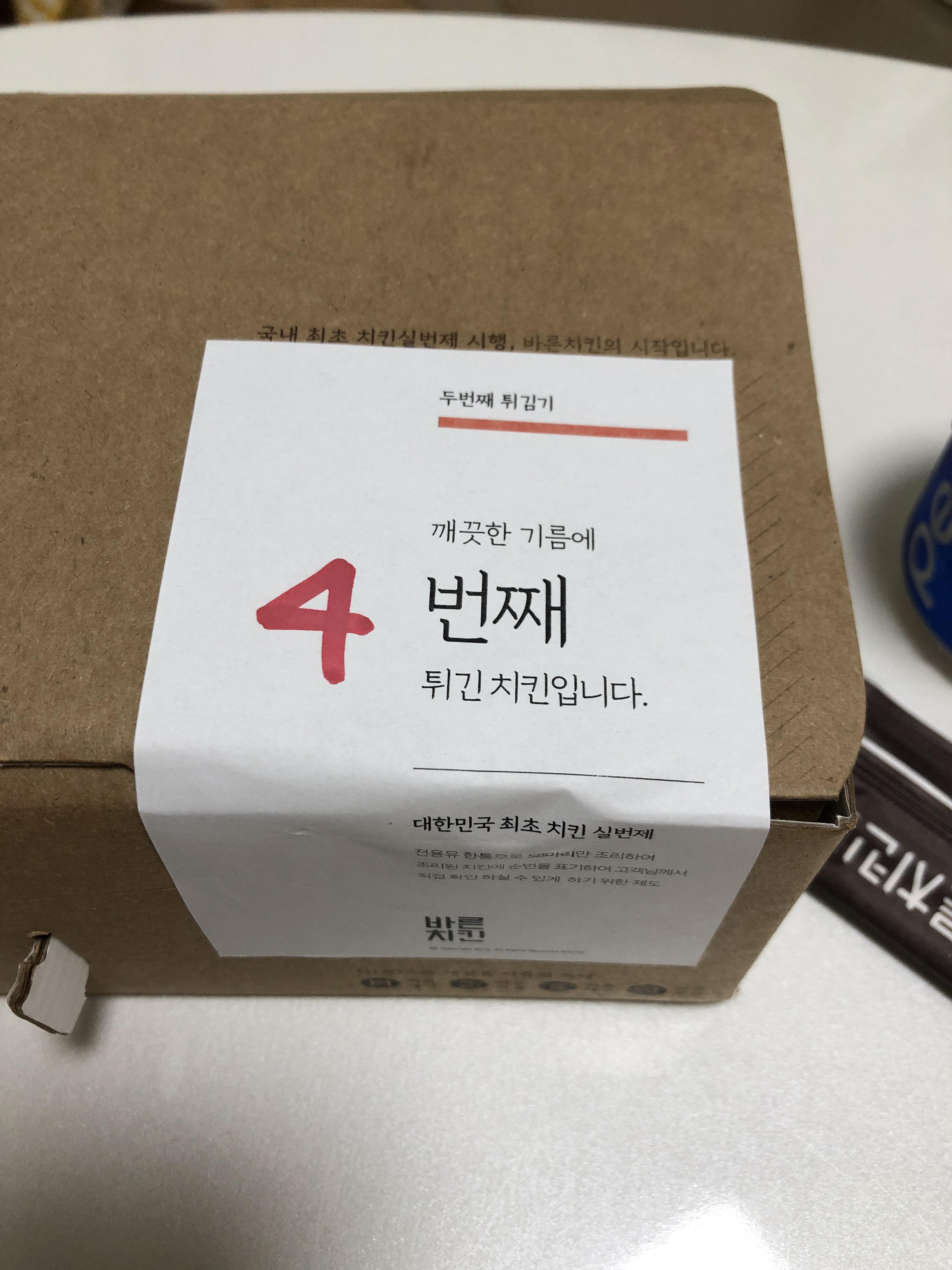 치킨박스에 4번째 튀긴 치킨이라는 스티커가 붙어 있는 게 인상적이었다. 깨끗한 기름과 좋은 식재료를 사용한다는 자부심이 느껴졌다. 바른치킨 전용 기름에 58마리까지만 튀겨서 깨끗하고 국내산 닭과 현미 파우더를 사용한단다. 바른치킨이라는 브랜드 이름답게 좋은 재료를 사용한다는 믿음이 갔다.