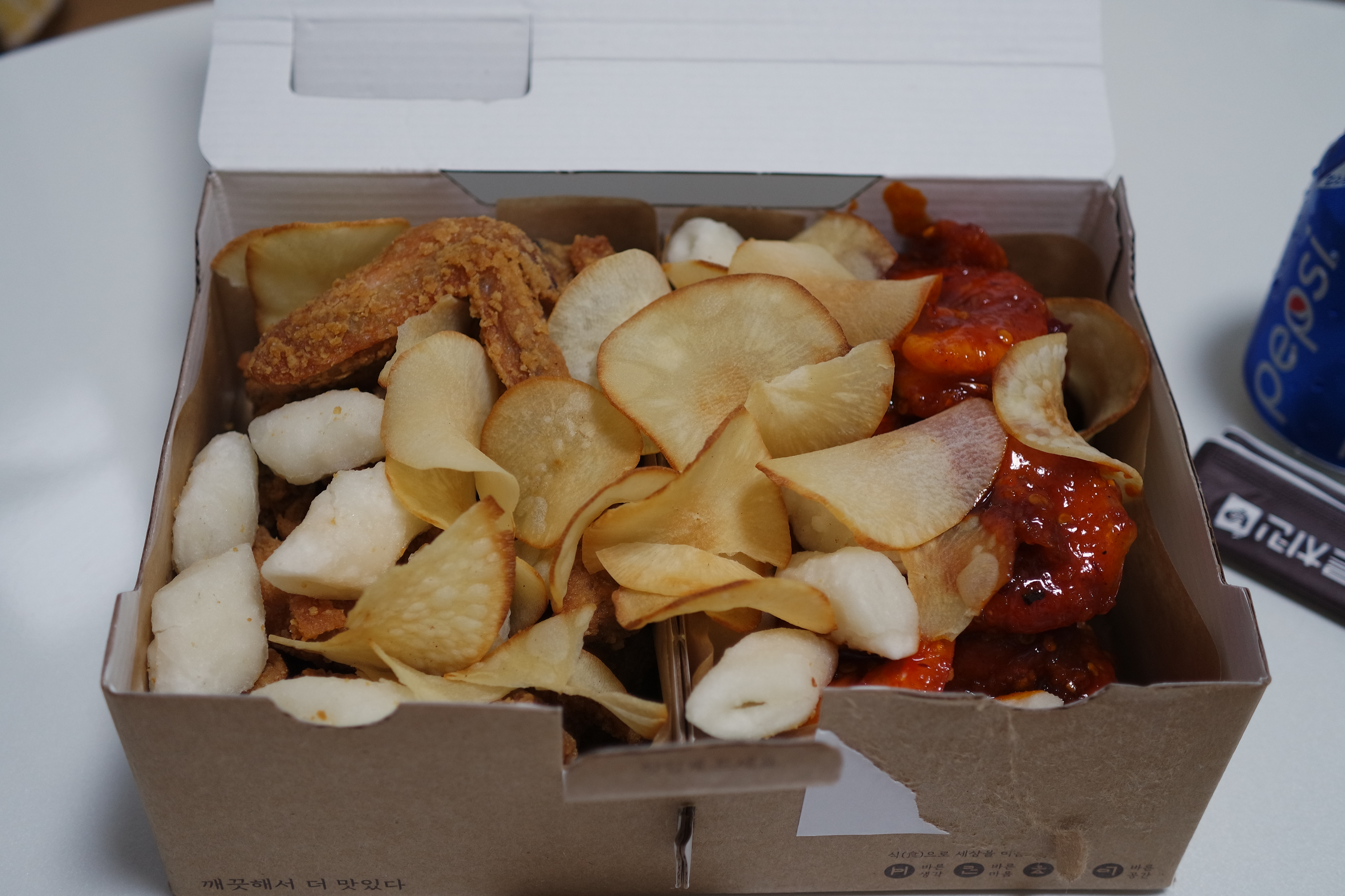 치킨과 펩시 캔콜라, 치킨무와 양념소스, 나무젓가락 2개와 물티슈가 비닐봉지에 담겨 왔다. 주문할 때 일회용품 안 주셔도 된다고 체크했는데 바쁘셔서 까먹으셨는지 같이 들어 있었다.