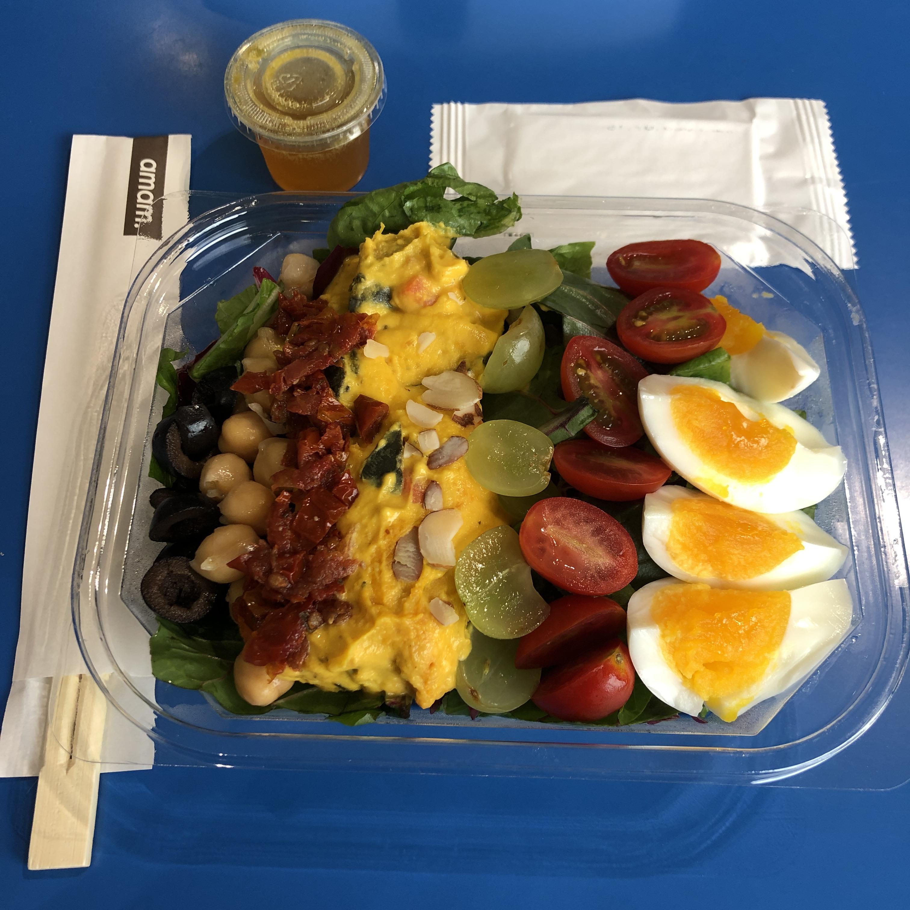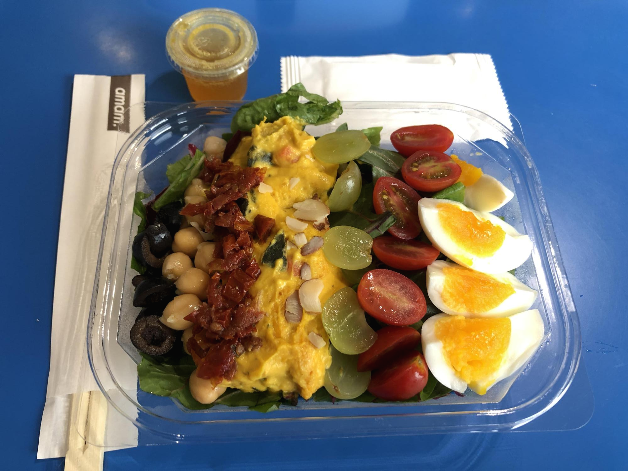 먹기 전에 한 컷! 색감마저 예쁜 단호박 선드라이 토마토 샐러드. 샐러드는 올리브, 병아리콩, 선드라이 토마토, 단호박, 청포도, 방울토마토, 반숙 계란, 적양배추, 초록 채소로 구성되어 있었다. 소스는 상큼한 유자맛이었다. 샐러드 위에 유자 드레싱을 부어 먹었는데 달짝지근하니 맛있었다. 구성된 모든 재료들이 싱싱했고 생각보다 든든해서 좋았다. 선드라이 토마토가 잘게 잘려 나와서 처음엔 '이거 뭐지?' 하면서 입에 갖다 댔는데 맛은 괜찮았다. 건강한 메뉴라 하루가 상쾌해지는 기분이었다.