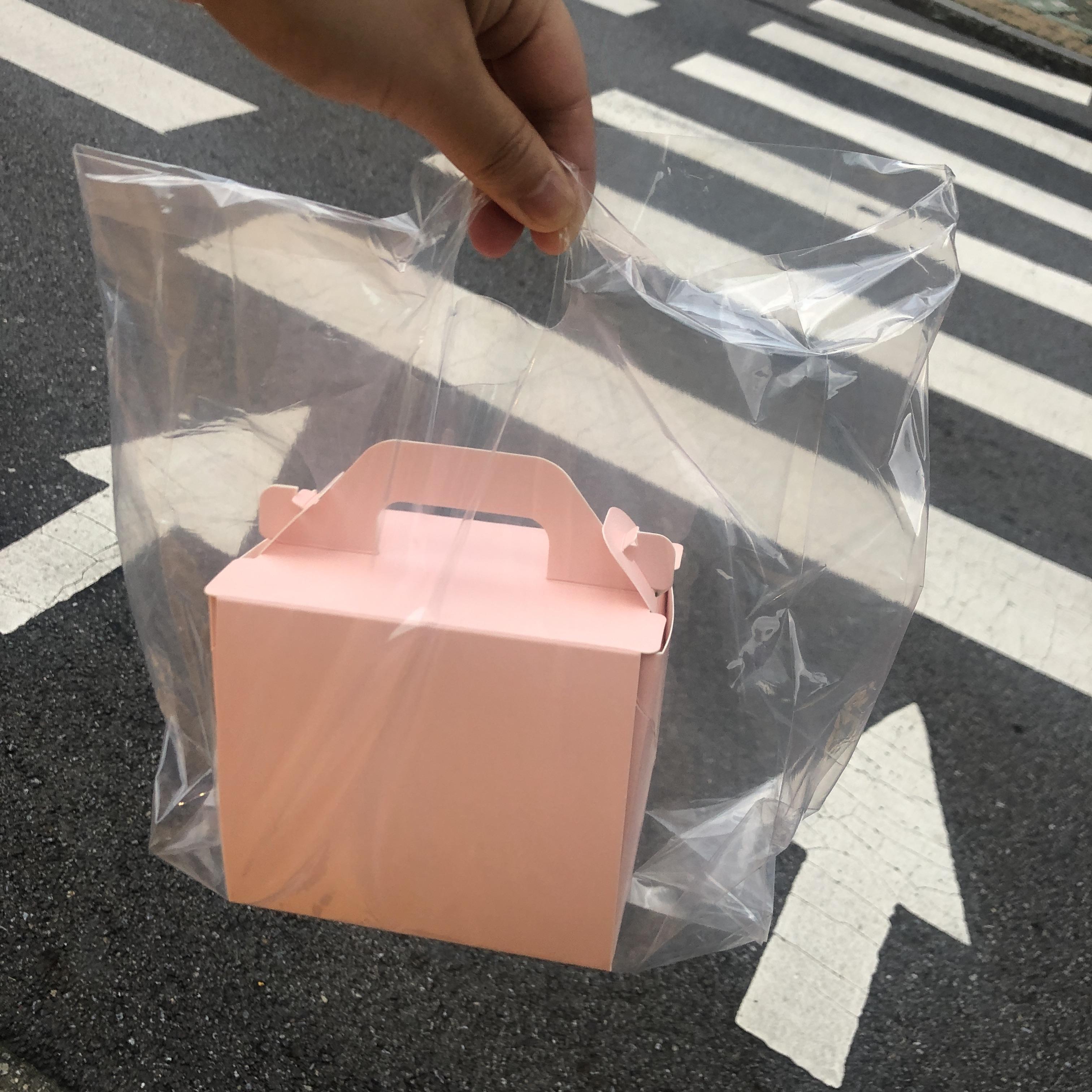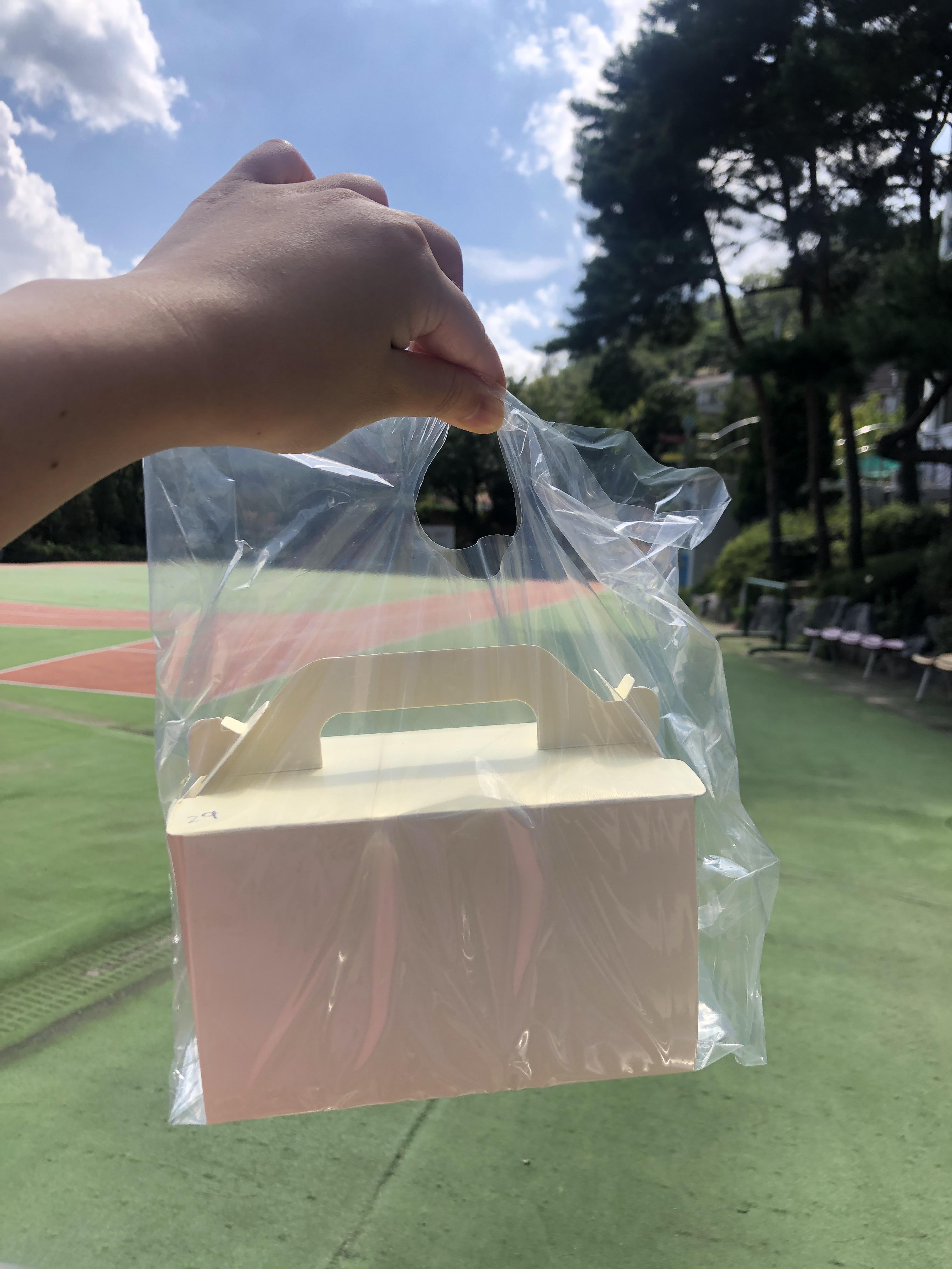 오늘은 두 조각 포장했더니 케이스가 노란색이었다. 날씨도 좋고 맛있는 케이크 먹을 생각에 신이 났다.