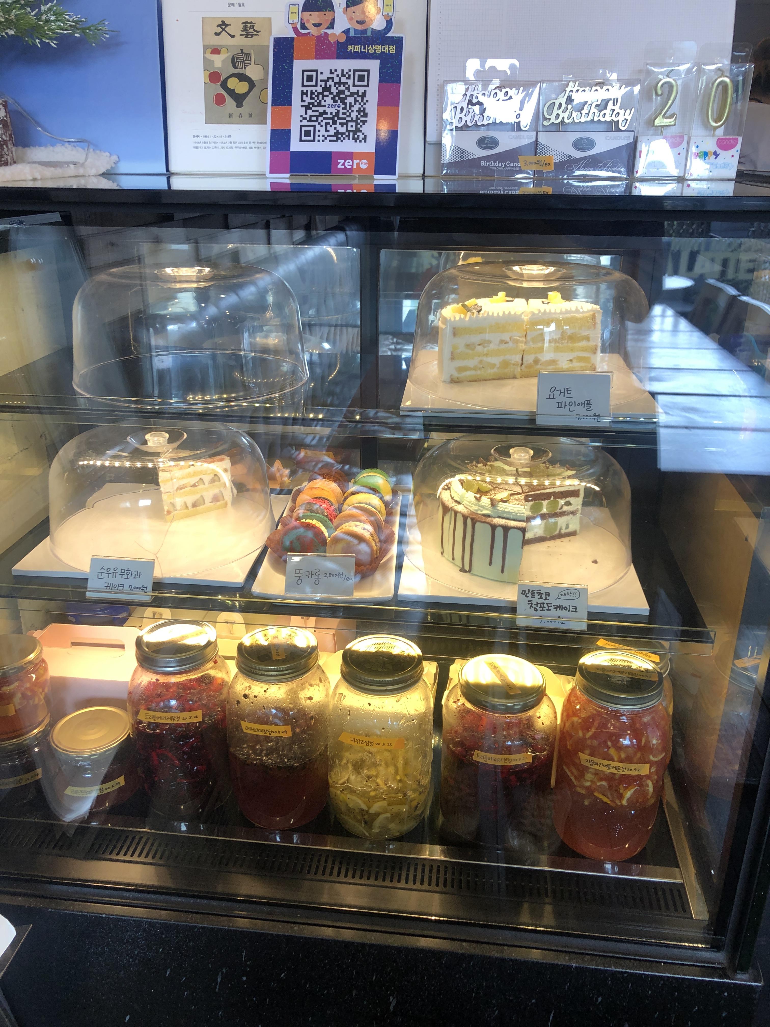 카운터에 예약했다고 말하니 전화번호 뒷자리를 물어보셨다. 예약 확인하고 결제를 한 다음에 케이크가 준비되기를 기다리면서 케이크 쇼케이스 사진을 찍어보았다. 예약 전화할 때 분명 순우유 무화과 케이크 품절 이랬는데 쇼케이스에 있어서 물어봤더니 예약 취소로 1조각 남았다고 했다. 그래서 케이크 바꿀 수 있는지 여쭤봤는데 그건 안되고 추가 구매만 가능하다고 했다. 순우유 무화과 케이크는 다음에 먹어봐야겠다. ㅠㅠ