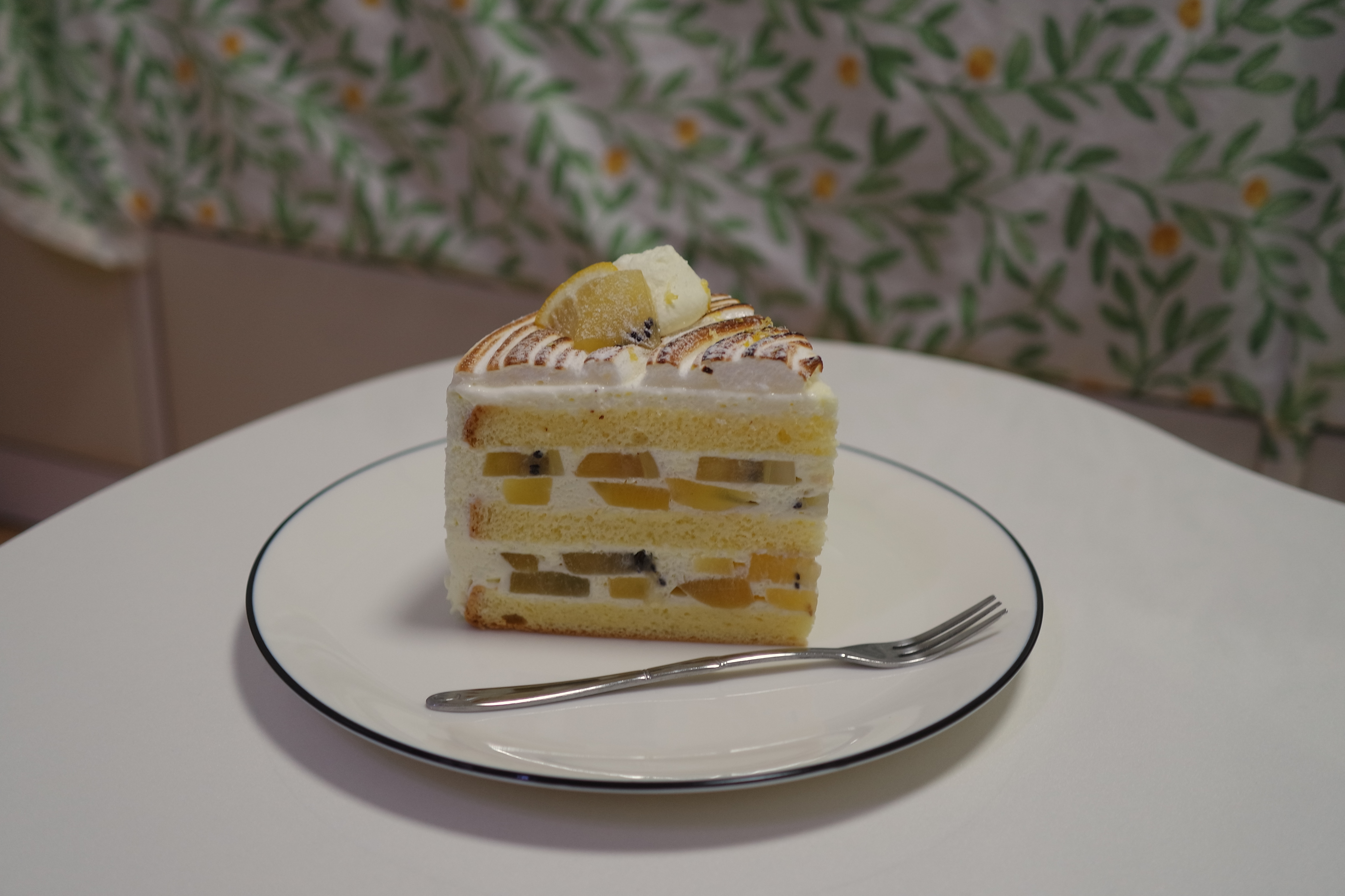 상단에 작은 레몬 조각과 골드 키위가 올려져 있었다. 위에 크림은 머랭 크림이라 살짝 단단한 느낌이었다. 케이크 시트가 3단으로 되어 있고 중간중간에 생크림과 골드키위가 겹겹이 쌓여있었다. 비주얼도 너무 좋고 맛도 진심 존맛탱! 크림에 들어간 레몬의 향기가 은은히 퍼졌고 키위가 달고 맛있었다. 크림이 많이 느끼하지 않아서 질리지 않고 계속 들어갔다. 혼자 케이크 한 조각 순삭 했다. 보통 시중에서 파는 조각 케이크보다 높고 큰 편이고 가격도 7,500원으로 저렴한 편은 아니지만 맛도 좋고 무엇보다 과일이 듬뿍 들어가 있어서 만족스러웠다. #메론머랭골드키위케이크