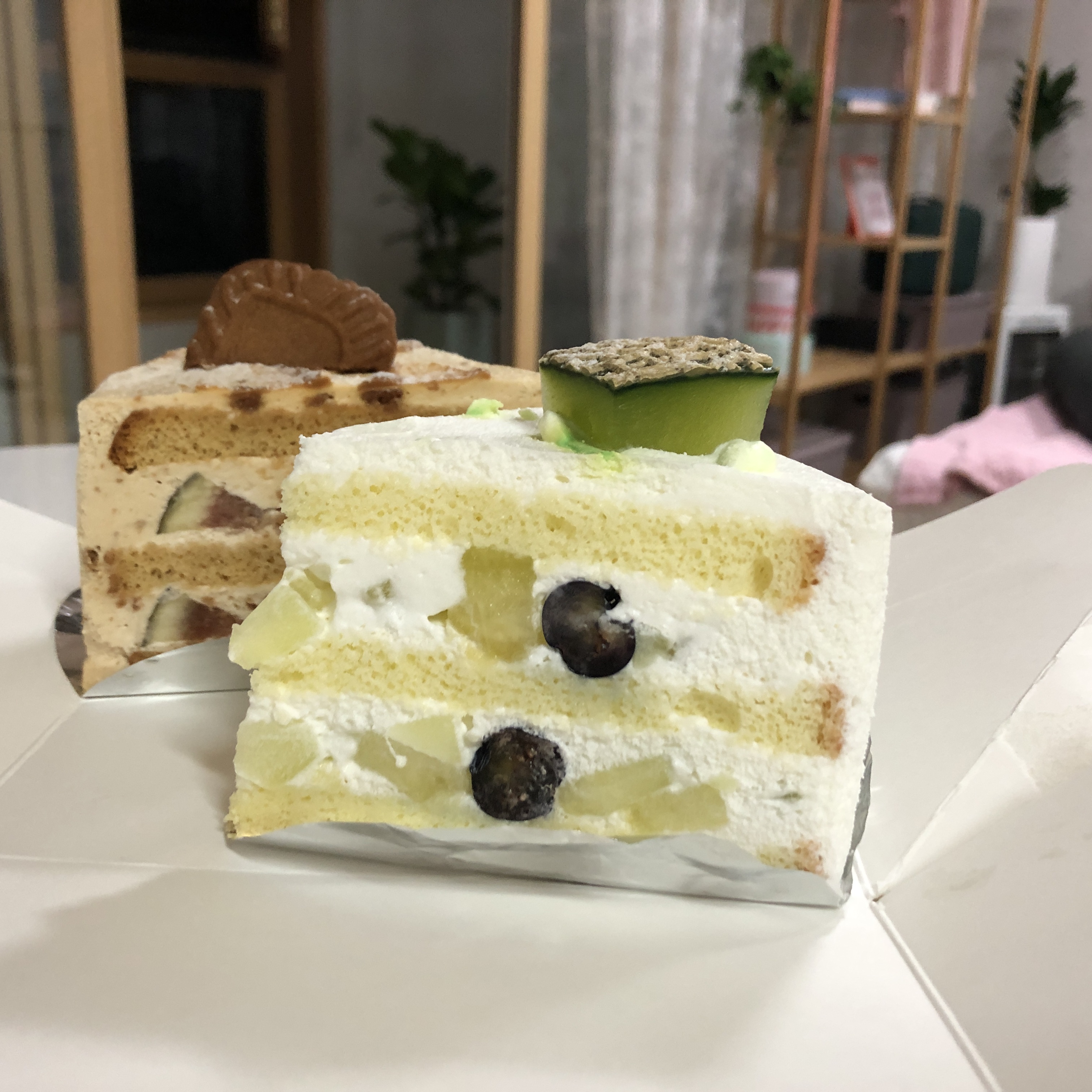 사장님이 고정핀이 없어서 케이크가 흔들릴 수 있다고 해서 조심스럽게 들고 왔더니 다행히 찌그러지지 않고 온전한 모습이었다. 밑에 얇은 은박지 같은 게 깔려 있었다. 예쁘게 접시에 옮겨 담아 먹었다.