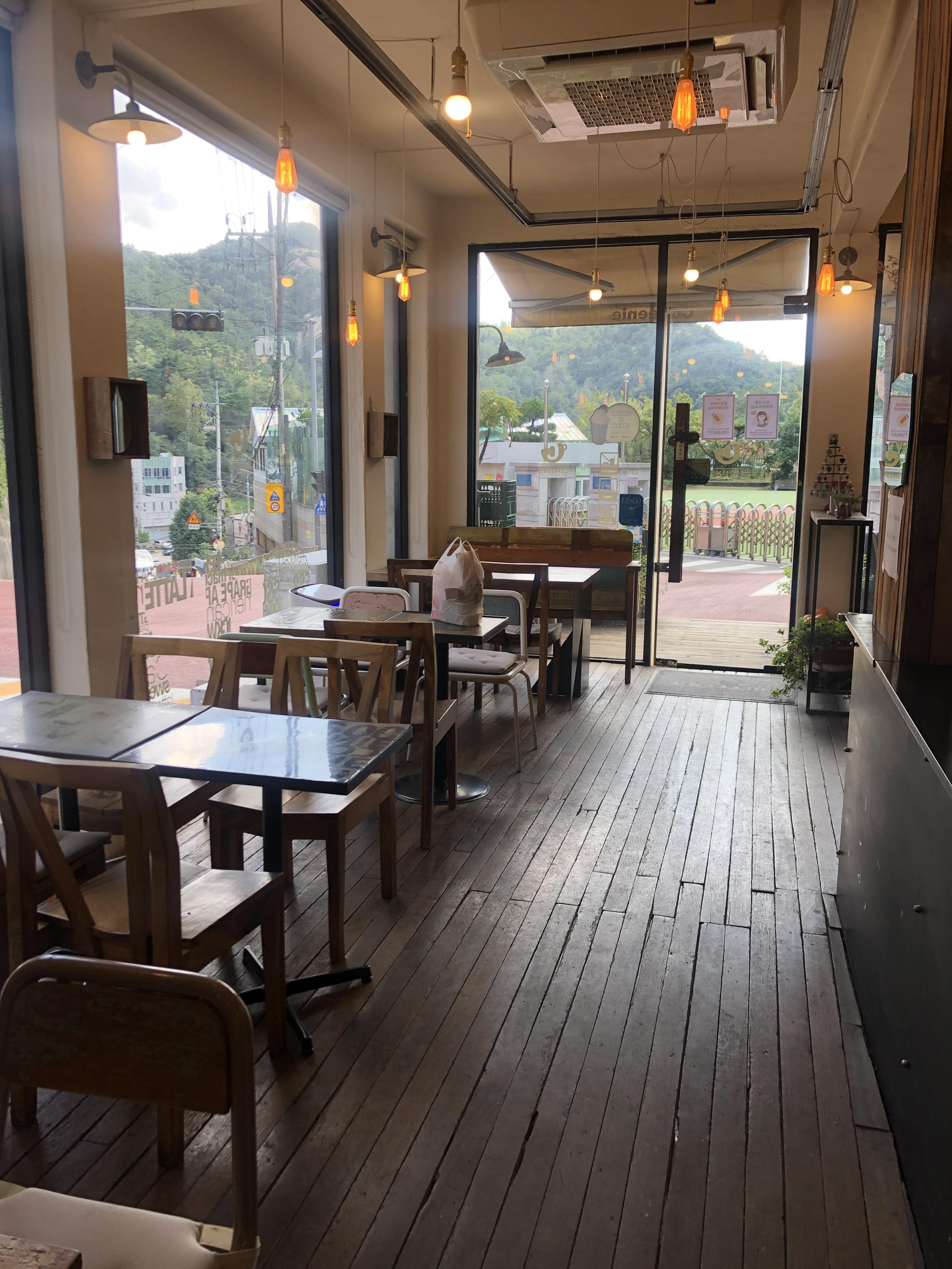 텅 빈 매장 사진도 한 장 찍어보았다. 넓지는 않고 4인 테이블 6개 정도 있음. 야외 테이블도 하나 있었다. 하지만 코로나 19 바이러스 때문에 앉아 있는 사람은 하나도 없었다.