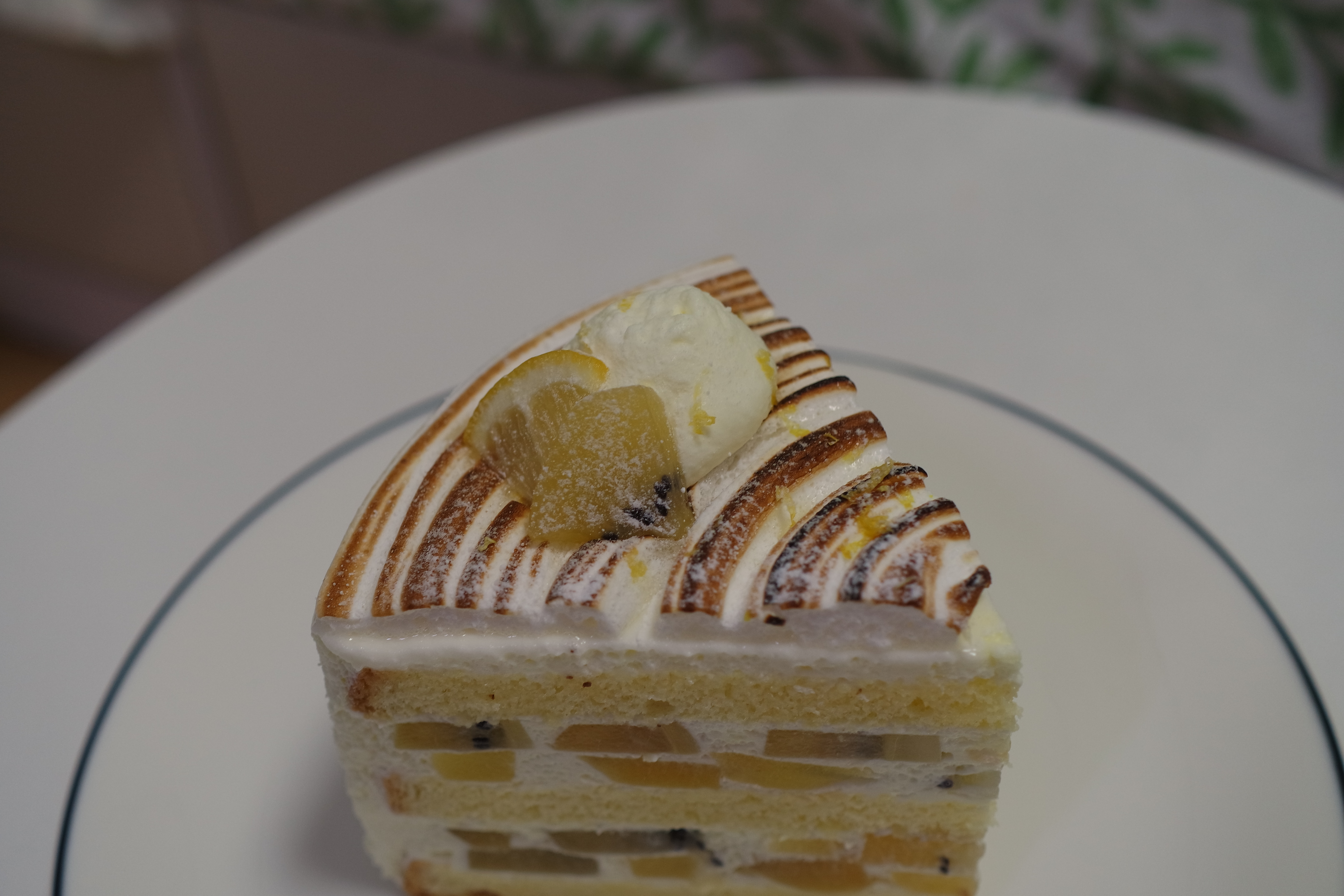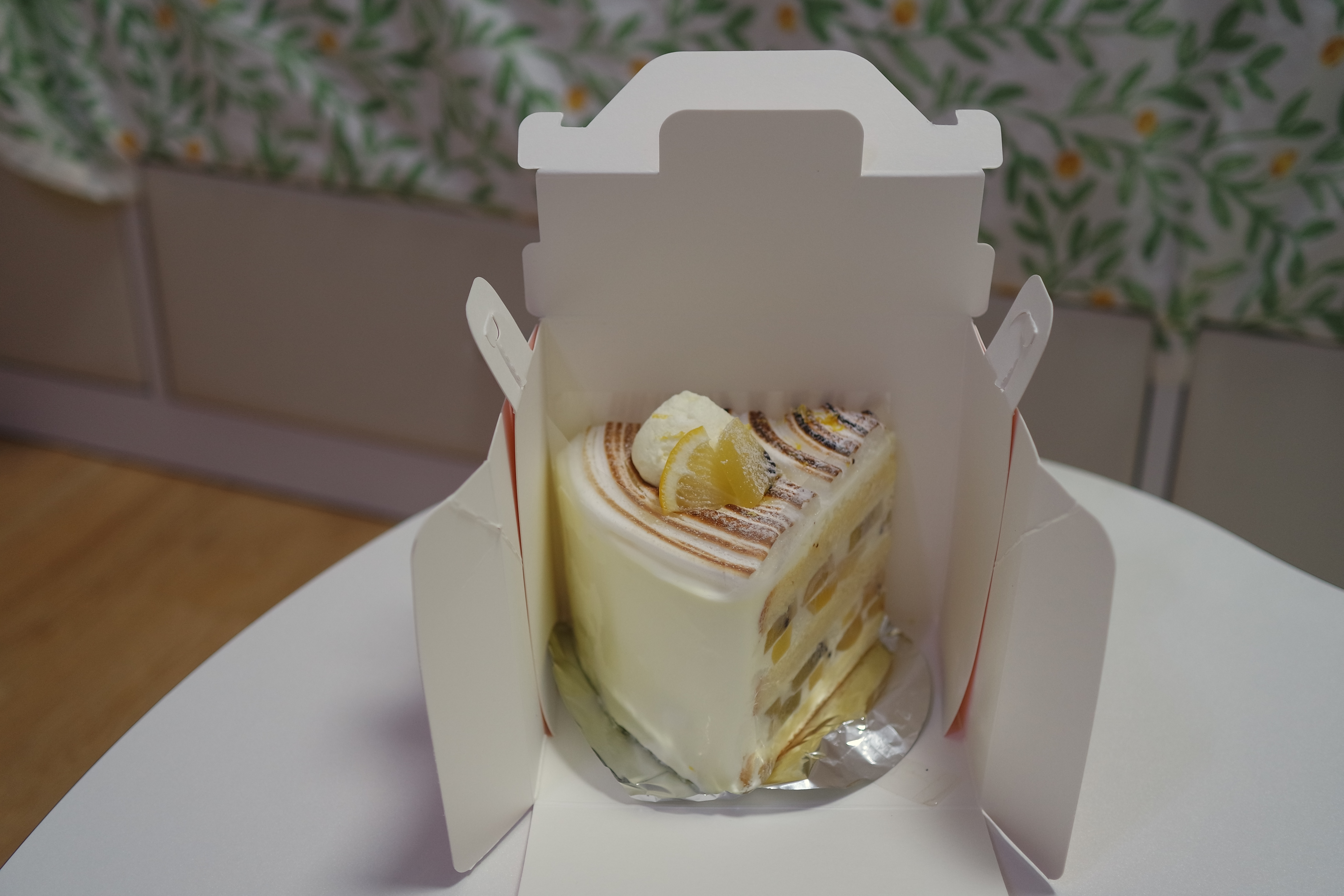 케이크 먹방 동영상을 본 날 당일에 예약 없이 방문했더니 케이크가 바나나 초코 케이크와 레몬 머랭 골드키위 케이크 밖에 없었다. 아쉬운 대로 레몬 머랭 골드 케이크를 한 개만 포장해왔다. 현재는 코로나 19 바이러스 예방 차원에서 매장 내 취식이 불가해 포장만 가능한 상태였다.