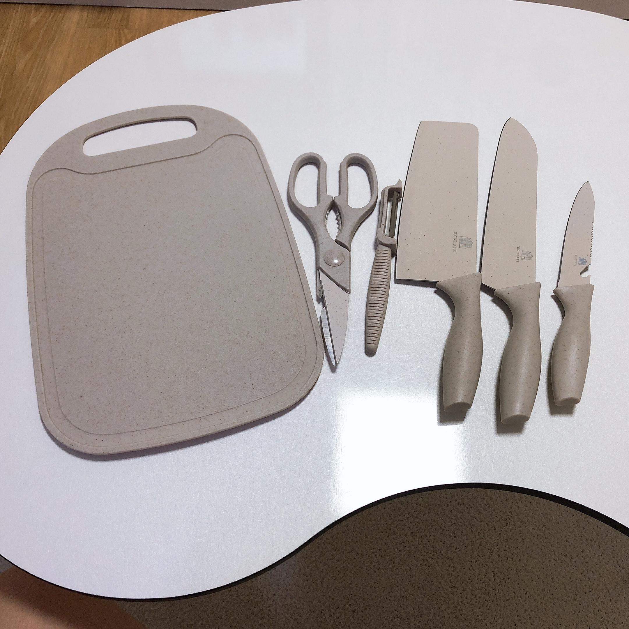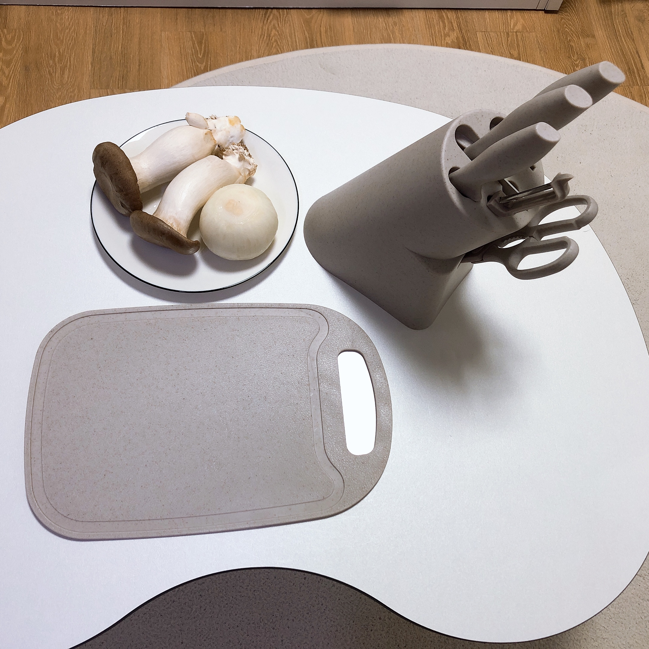 주방에서 사진을 찍었더니 조명탓인지 빛이 얼비쳐서 자리를 옮겨서 찍어 보았다. 슈나츠 5종 세라믹 칼세트는 주방용 가위, 감자칼, 중식도, 아시아식도, 과도칼까지 5종으로 구성되어 있다. 나는 론칭 기념으로 도마까지 증정 받았다. 색상은 분홍색, 민트색, 베이지색 세 가지가 있고 나는 우리 집 부엌과 잘 어울릴 것 같은 베이지색으로 구입하였다.