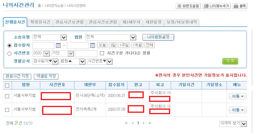 지급명령 인지액 보정 후 [나의 사건 관리]에 새로운 사건이 추가되었다.