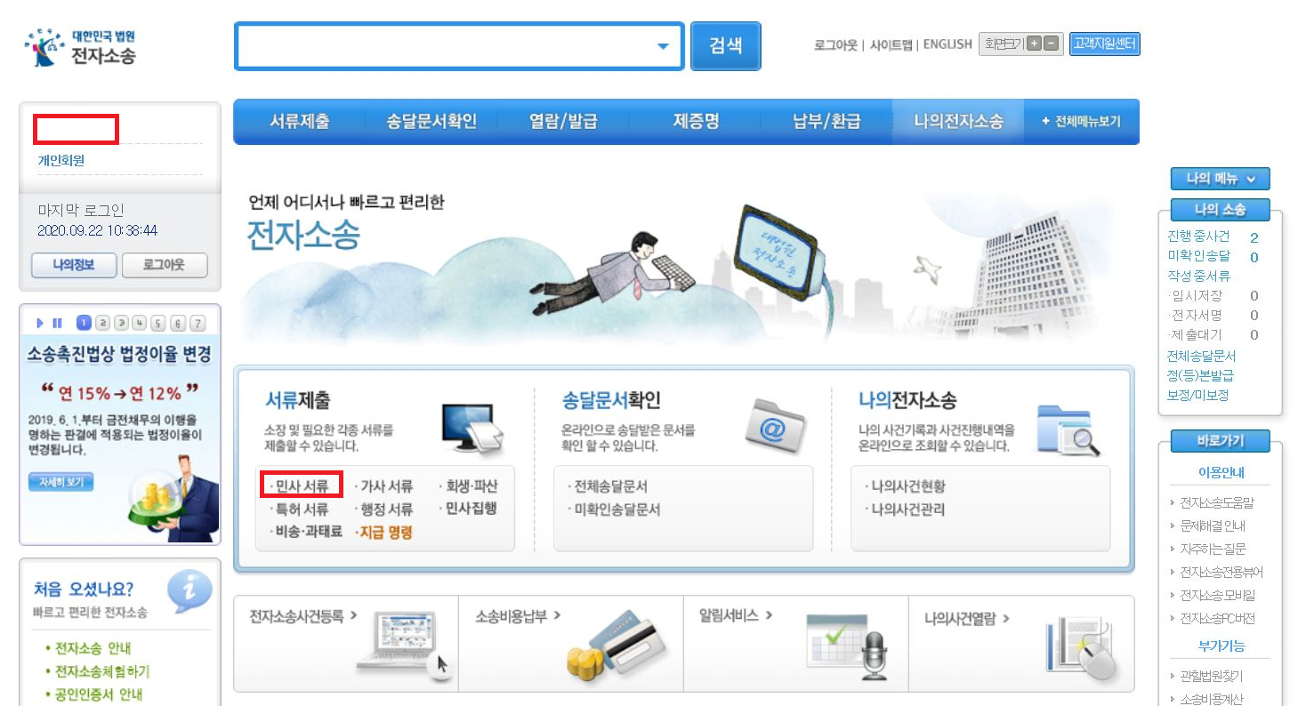 전자소송 사이트 중간 부분에 [민사 서류 -> 소취하서]를 클릭한다.