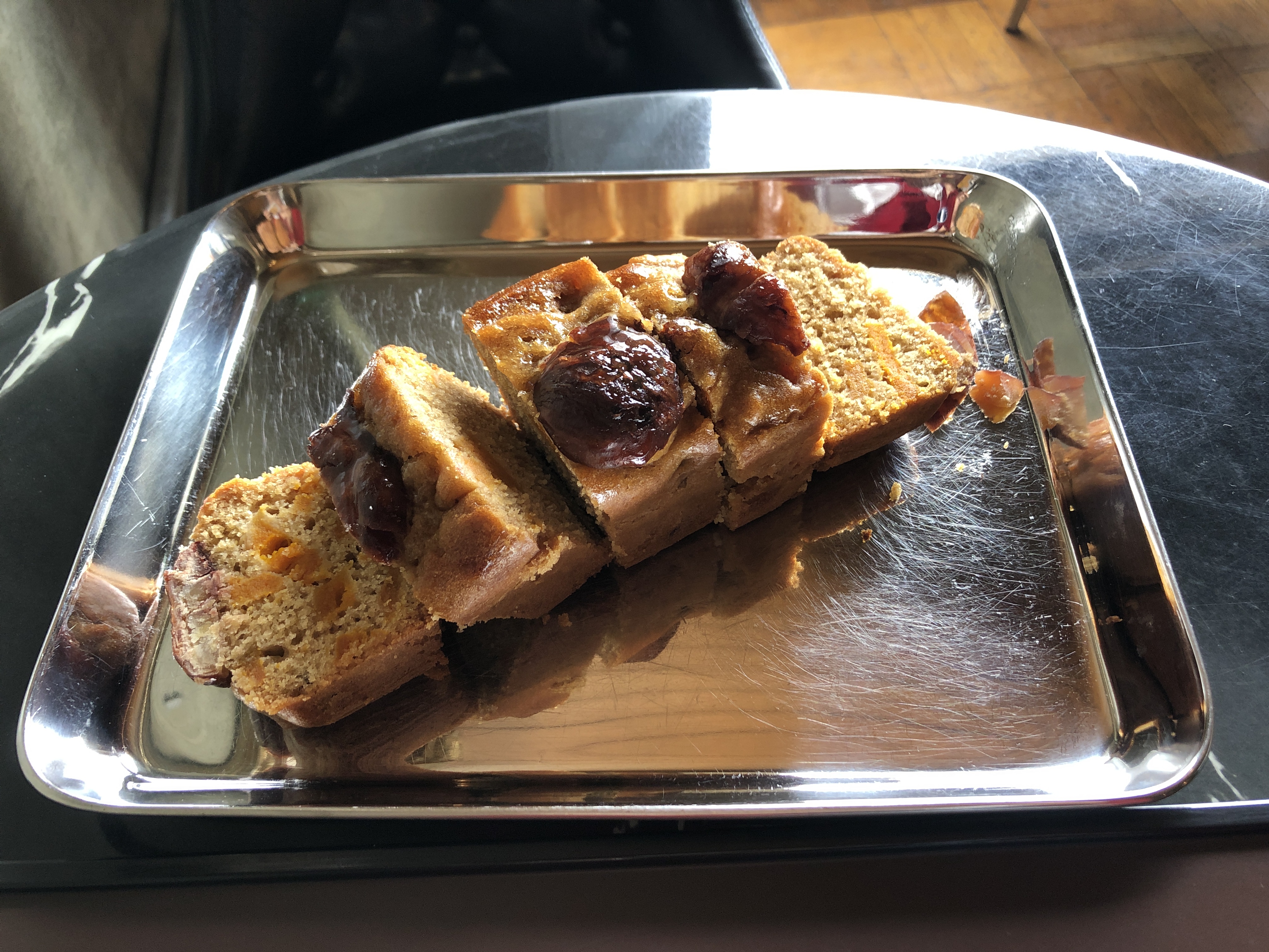 그리고 단호박 파운드케이크도 정말 내 취향이었다. 이름은 단호박 파운드케이크지만 위에 큰 밤이 콕콕 박혀 있었다. 밤도 너무 좋아하는 나로서는 진짜 싫어할 수 없는 메뉴였다. 특유의 단호박 냄새도 좋고 단호박 고유 단맛이 잘 느껴졌다. 인공 단맛(설탕 단맛)은 강하게 느껴지지는 않았지만 파운드케이크니까 설탕이 많이 들어가긴 했겠지... 그래도 괜찮아. 맛있으니까!