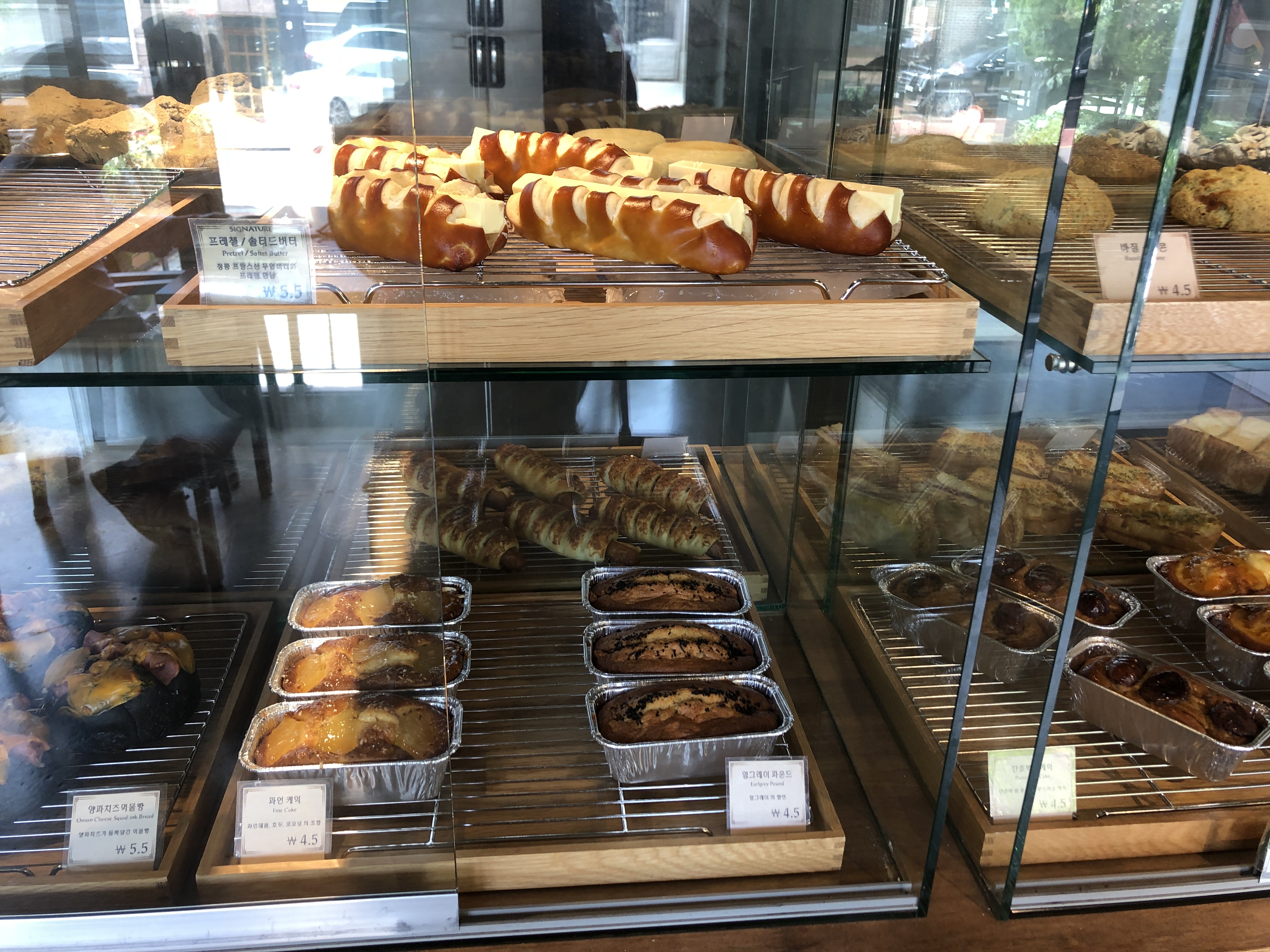 베이커리 진열대에도 식빵, 소시지빵, 파운드케이크, 앙버터 등 다양한 제품들이 있었다. 냄새가 너무 좋고 다 맛있어 보여서 한참을 고민하다가 구황작물 덕후인 나는 참 나다운 메뉴를 골랐다. 단호박 파운드케이크를 쟁반에 담아 카운터로 가져갔다. 음료는 당연 커피 먹을 건데 날씨가 제법 선선해졌으니 따뜻한 카페라떼로 시켰다. 드립 커피, 에스프레소 커피, 티와 주스, 시그니처 음료까지 다양한 메뉴가 있었다. 주문하고 자리를 잡으러 2층으로 올라갔다.