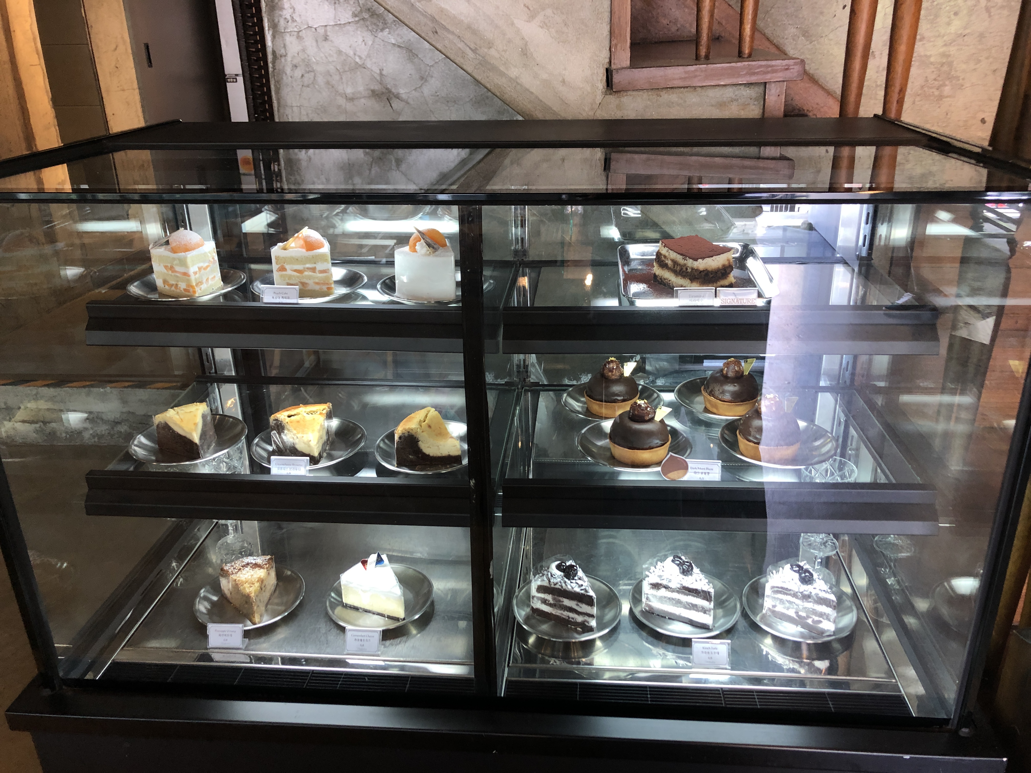 케이크 쇼케이스에 예쁘고 맛있어 보이는 조각 케이크가 가득 채워져 있었다.