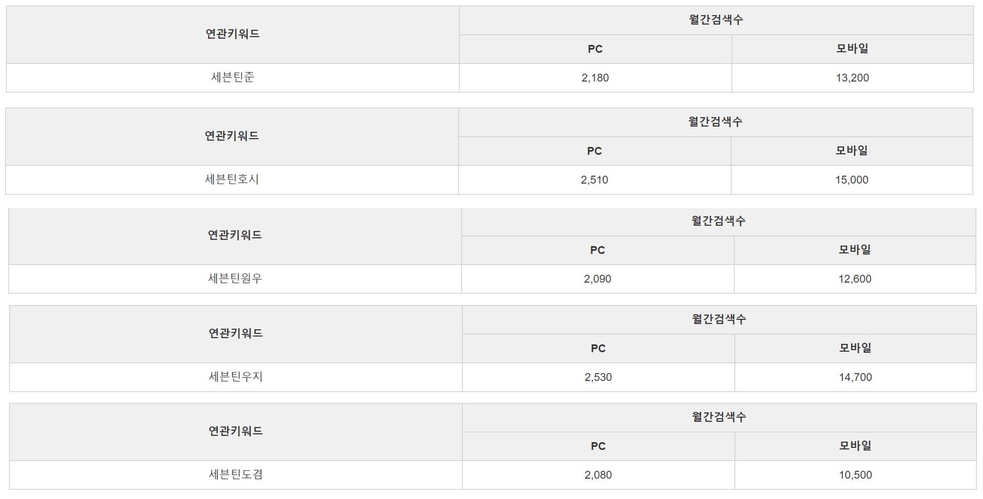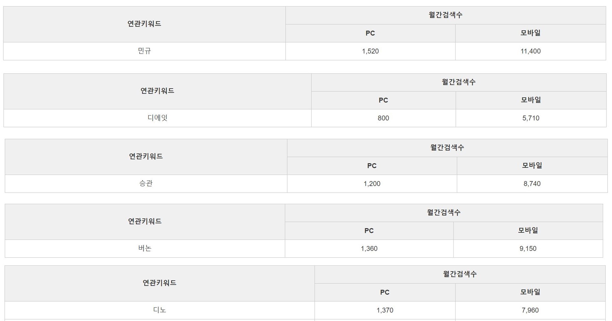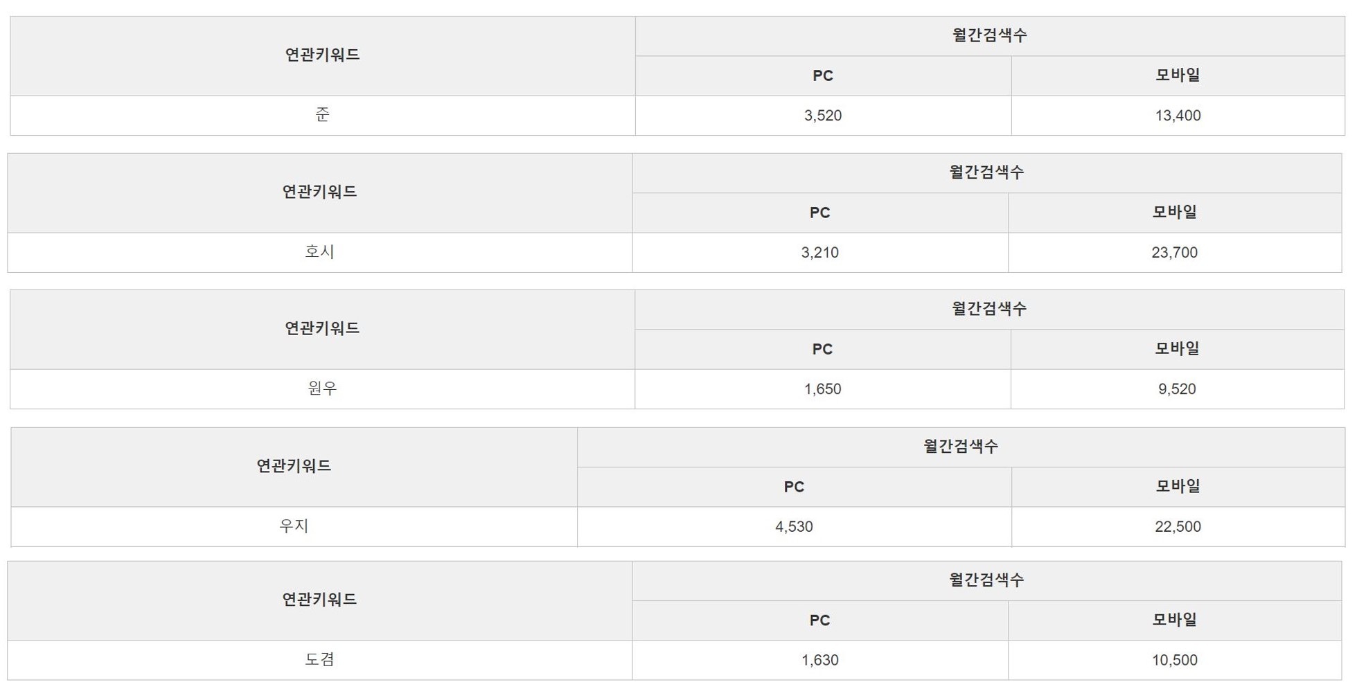 다른 멤버들은 본명으로 검색했을 때 검색량이 1000 안팎인데 반해 우지와 민규의 본명 검색량이 미친 듯이 많길래 직접 네이버에 검색해서 확인을 해 보았다. 알고 보니 우지와 민규 둘 다 본명 동명이인이 20명씩 나왔다. (바로 납득) 그리고 특이하게 승관이는 사람들이 활동명, 그룹명+활동명으로 검색했을 때보다 본명으로 검색을 훨씬 많이 했다. 승관이 성이 특이해서 다들 활동명 승관보다 본명 부승관으로 더 잘 알고 있기 때문인가 보다.