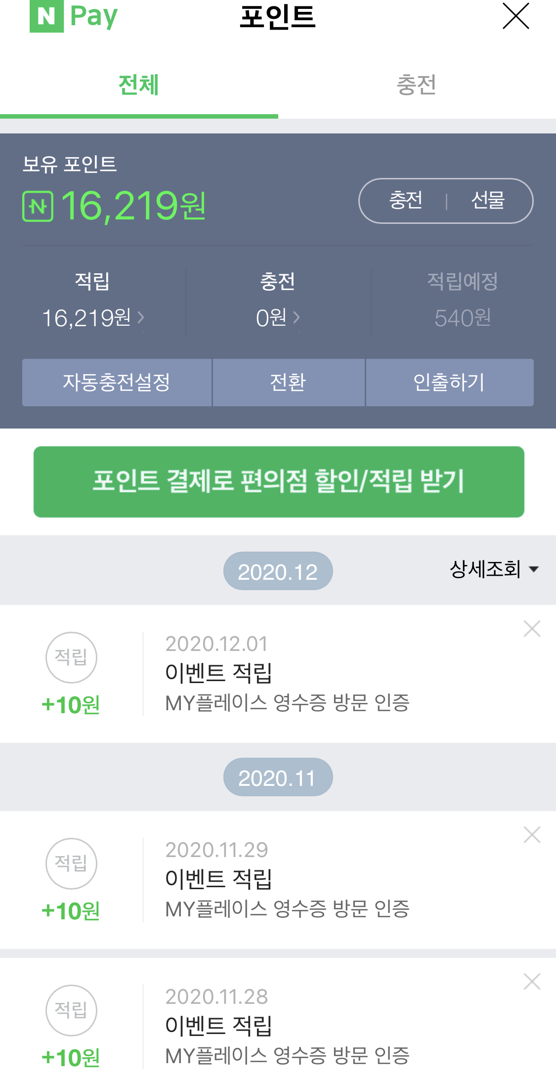네이버마이플레이스는 영수증을 등록하여 네이버페이 포인트를 받는 형태이다. 영수증을 사진 찍어서 등록하면 처음 방문한 업체는 50원 적립, 재방문한 업체는 10원씩 적립된다. 하루에 최대 영수증 5개 까지 등록됨. 내가 처음 네이버 마이플레이스를 시작했을 때는 이벤트중이어서 1, 3, 5, 7, 10번째 첫 방문하는 곳 영수증을 등록하면 각 500원씩 적립되기도 했었는데 지금은 어떨지 모르겠다. 적립금을 네이버페이 포인트로 영수증 등록 즉시 지급받기 때문에 매우 편리하다. 1번 인증으로 쌓인 50원을 네이버 쇼핑할 때 합산해서 바로 사용할 수 있다. 굿굿!