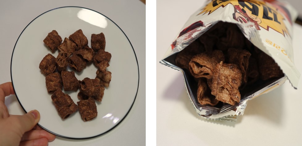 - 맛 평가 : 꼬북칩 초코츄러스는 칩에 진한 초콜릿이 겹겹이 발라져 있다. 칩이 4겹으로 되어 있어서 경쾌한 식감이 무척 좋았다. 초코덕후인 나에게는 진한 초코맛이 느껴져서 더욱 좋았다. 제품명에 '츄러스'가 들어간만큼 진짜 '츄러스'처럼 슈가토핑이 뿌려져 있는 디테일도 마음에 들었다. 슈가파우더 같은 느낌이 아니라 꽤 커다란 설탕입자가 눈에 보였다. 사진에는 과자양이 적어보이지만 실제로는 양이 꽤 넉넉했다. 사진 찍으려고 과자를 접시에 반만 덜어놓아서 양이 적어보임. 내가 구입한 것은 80g짜린데 더 큰 사이즈(160g)도 있다. #오리온과자 #초코과자
