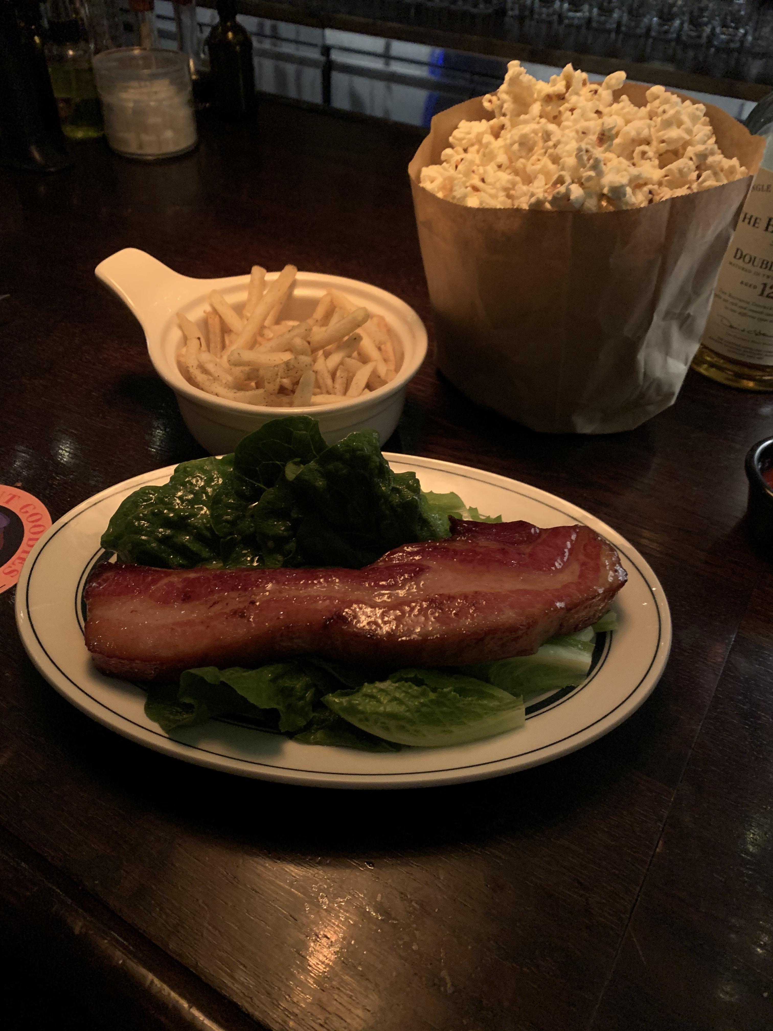 스테이크 비싸다고 생각했는데 막상 나온 거 보니까 구성도 좋고 맛도 너무 좋아서 돈이 하나도 안 아까웠다. 스테이크를 주문하면 샐러드와 감자튀김이 같이 나온다. 감자튀김은 양도 많고 맛도 괜찮았다. 샐러드는 로메인 위에 통베이컨 올려져 있었다. 베이컨이 달달하면서도 감칠맛 있고 양도 넉넉해서 정말 만족스러웠다. 진토닉이랑 진짜 잘 어울렸다.