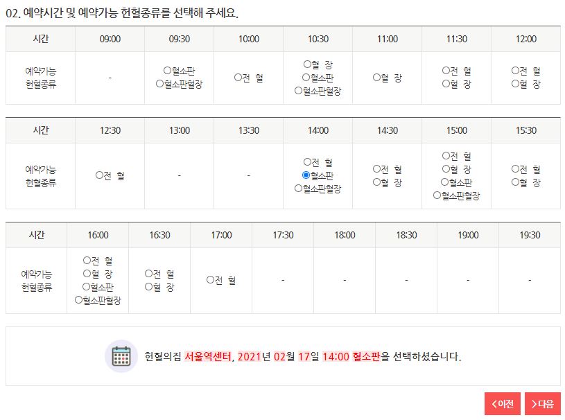 - 헌혈 예약 시간과 헌혈 종류를 선택하고 다음을 누른다.