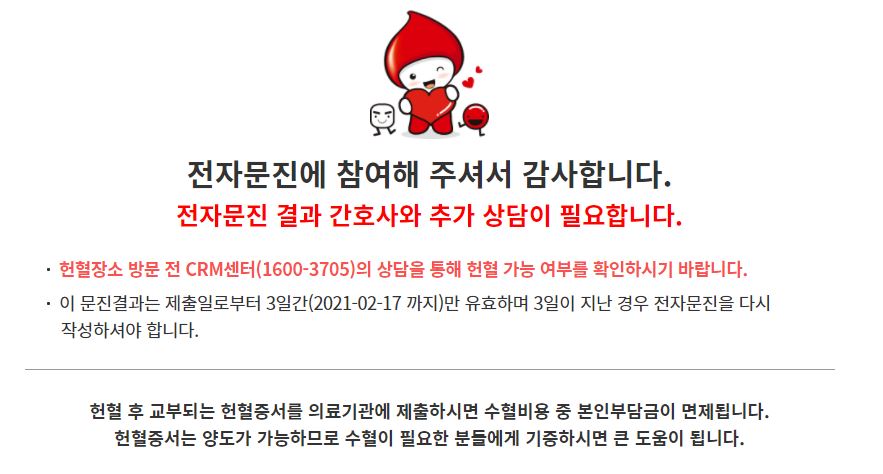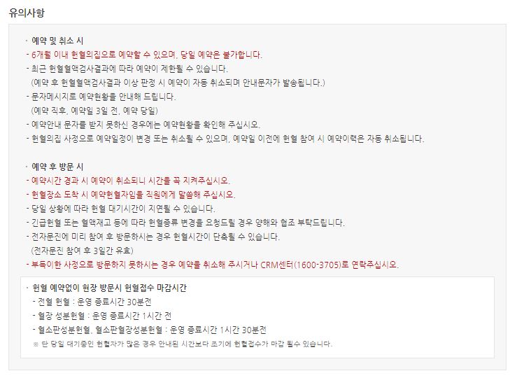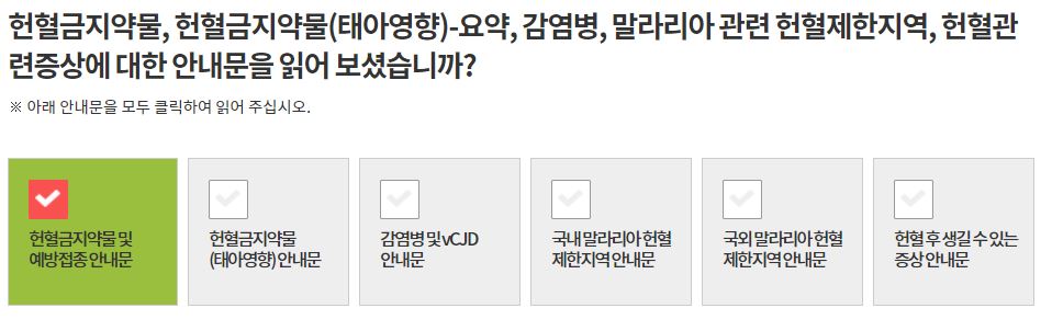 - 헌혈 금지 약물 및 예방 접종, 감염병, 말라리아, 헌혈 제한 지역 방문 관련 정보, 헌혈 후 생길 수 있는 증상에 대한 안내문을 꼼꼼히 읽어보고 정확하게 체크를 한다.