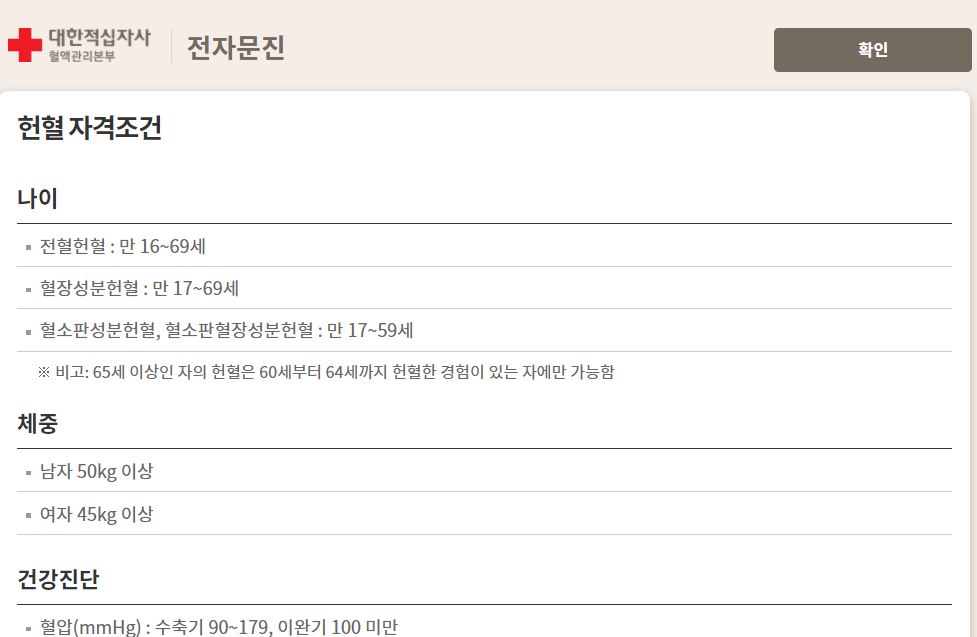 - 그러면 전자 문진에 앞서 헌혈 자격 조건 등이 나온다. 해당 내용을 읽어본 후 넘어간다.