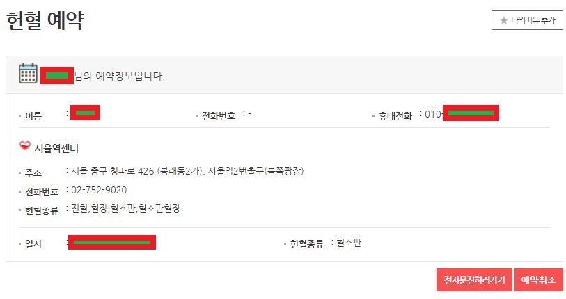 - 그럼 헌혈 예약이 완료된다. 예약한 정보를 확인할 수 있다.