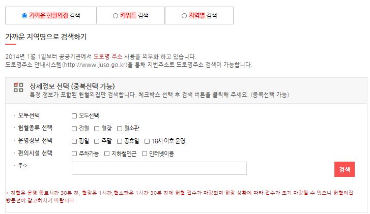 - 방문할 헌혈의 집을 선택한다. (주소 입력 후 검색 클릭하기)