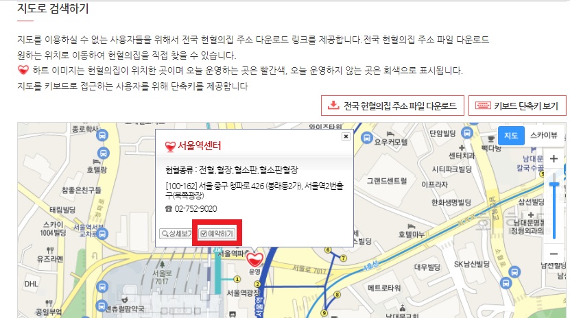 - 그럼 하단 지도에 예약할 수 있는 헌혈의 집이 하트 모양[💖]으로 표시된다. 헌혈의 집을 클릭하고 예약하기 버튼을 누른다.