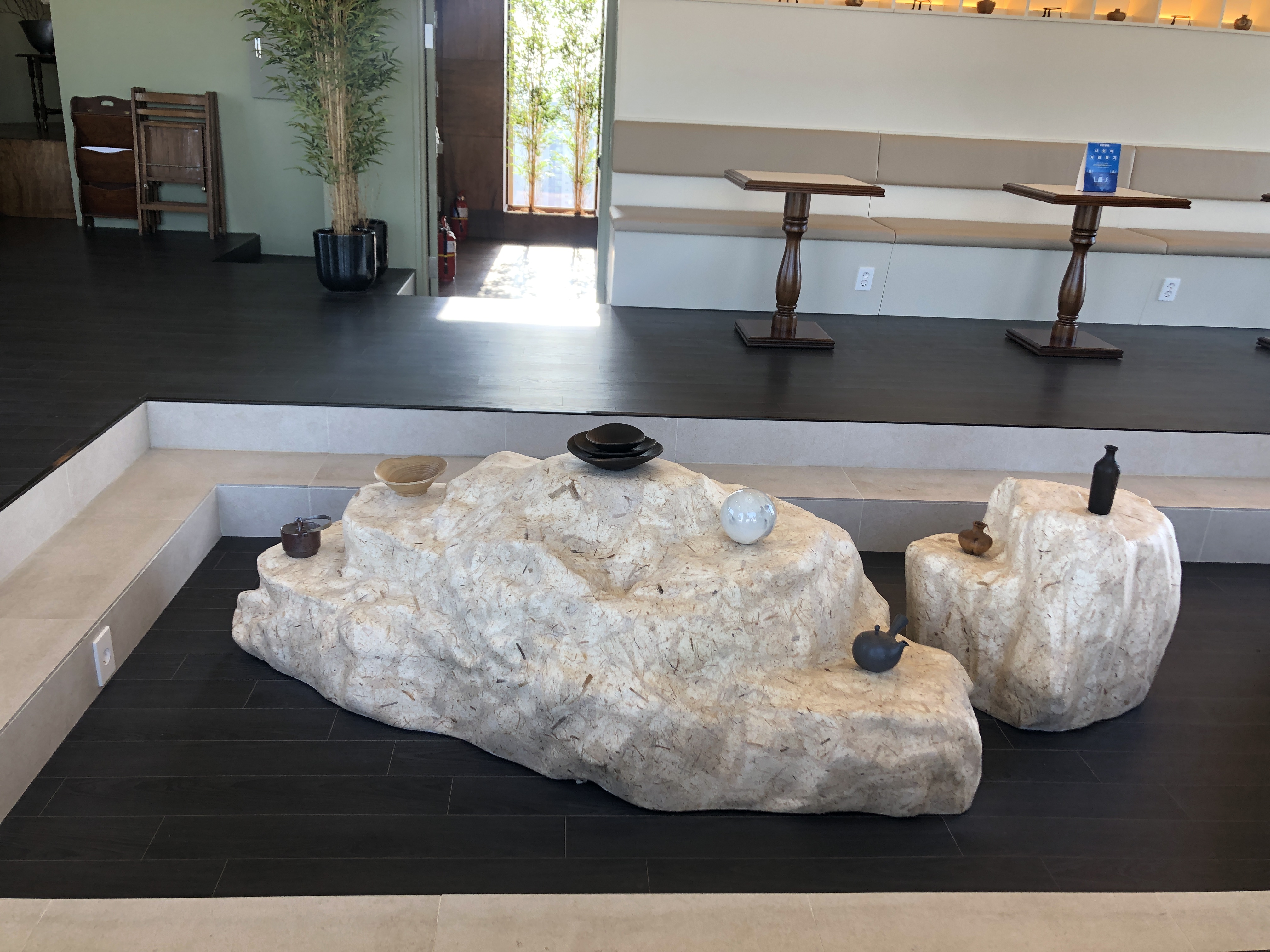 매장 가운데에 인테리어용 돌이 있었다. 그 위에 예쁜 다기가 얹어져 있어 포인트가 되었다. 하지만 바닥 잘 보고 다녀야 된다. 핸드폰하다가 엎어지기 십상이다. (내 얘기라고 한다... ^^)