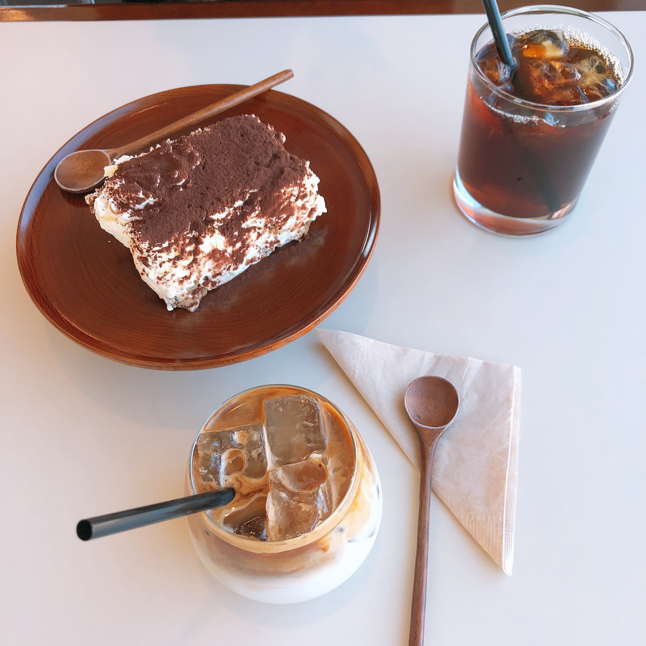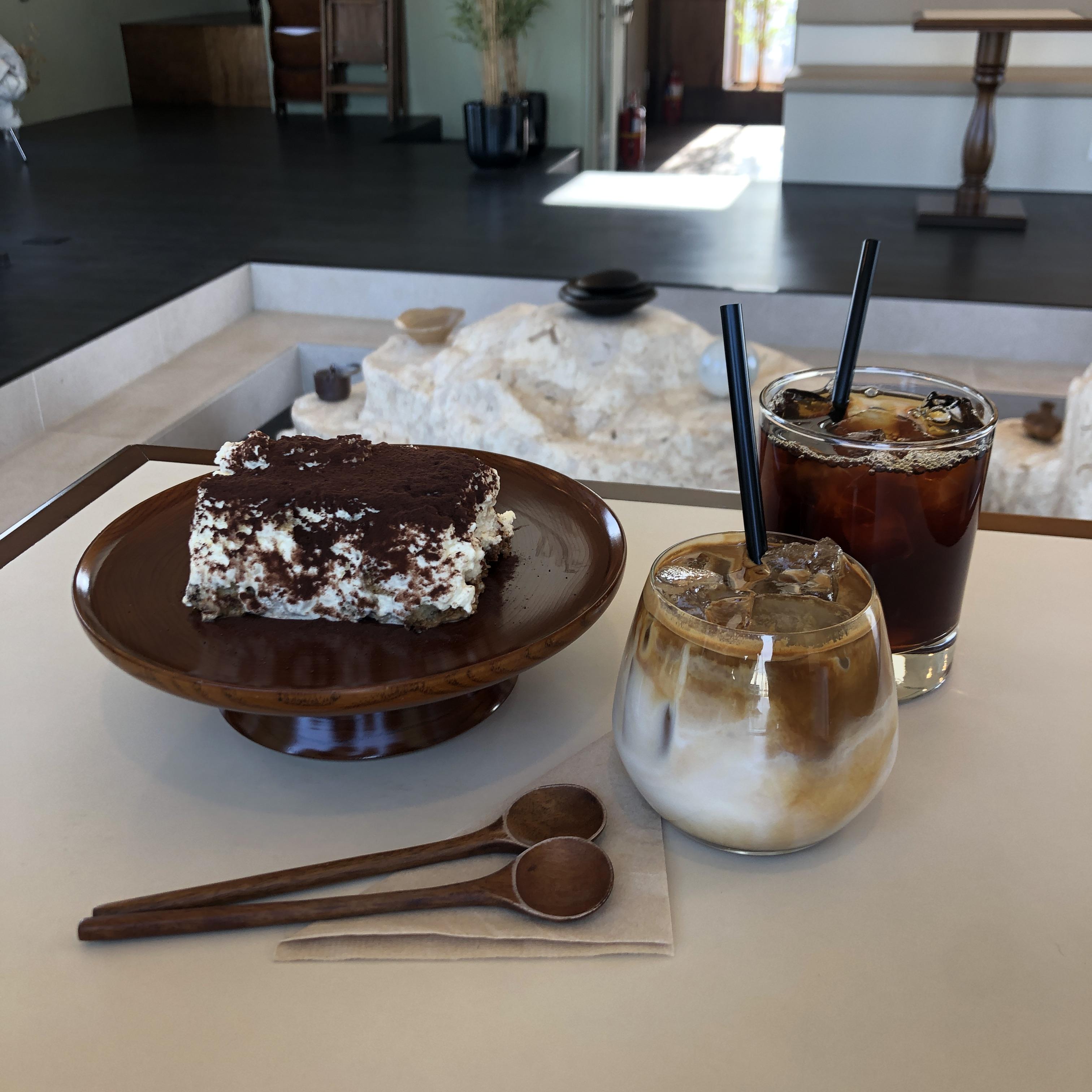 우리는 카페라떼 아이스와 드립커피 아이스, 티라미수 일반을 주문했다. 숟가락과 티라미수 접시가 모두 나무였다. 예쁘긴한데 티라미수 접시가 매우 제사용 그릇 같았다. 제기 그릇같은 느낌 탓에 티라미수가 아니라 팥시루떡 같은 느낌이 들었다.