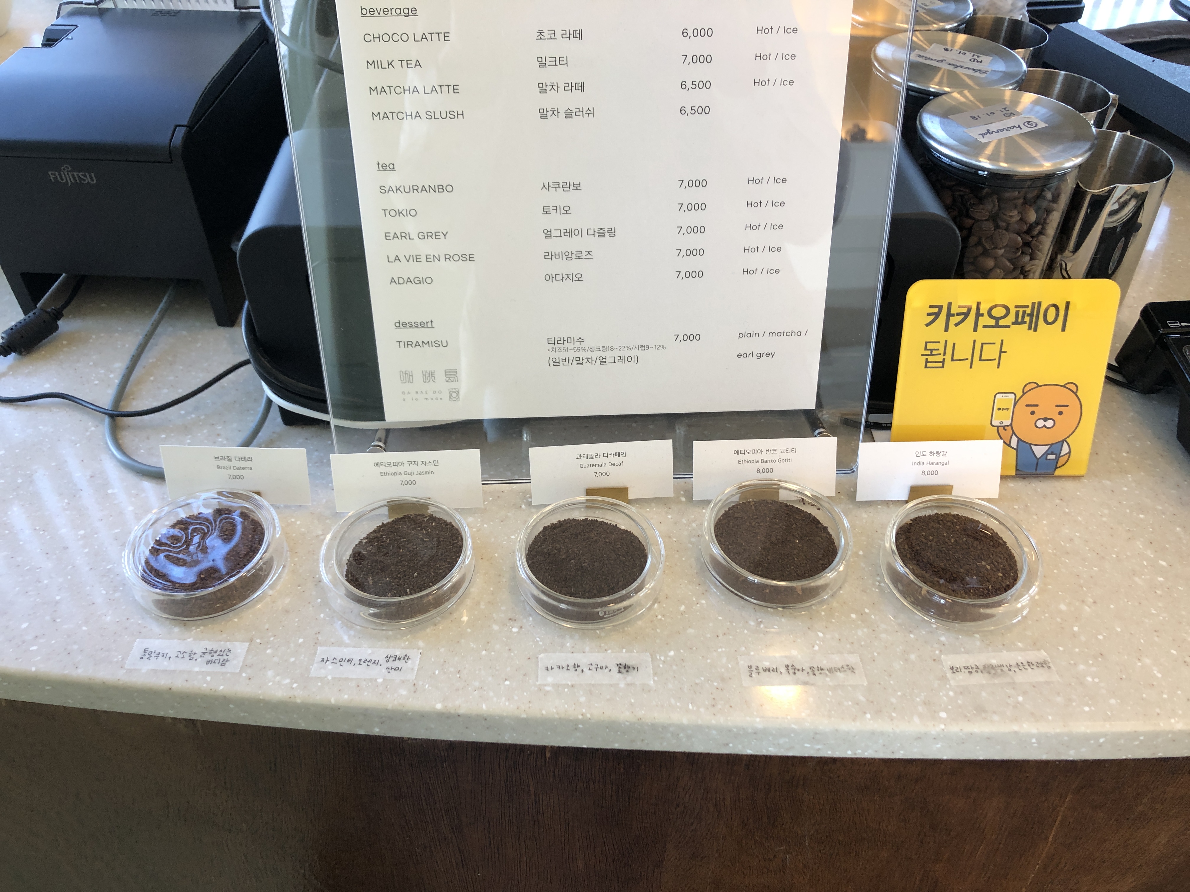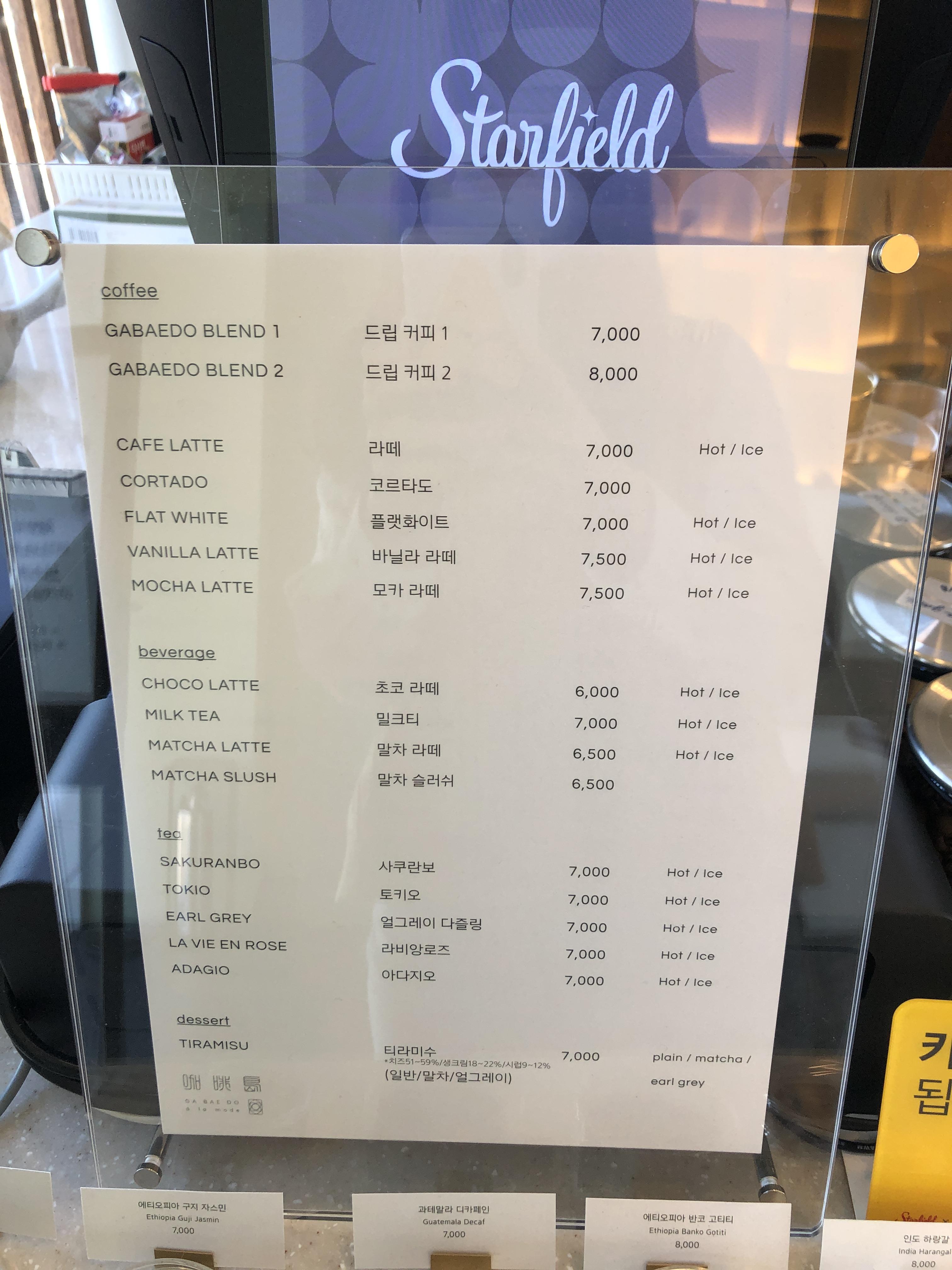 가배도는 커피를 주력으로 하지만 티와 라떼 종류도 있다. 디저트는 티라미수 3종류만 있었다. 가격대는 조금 높은 편이다.