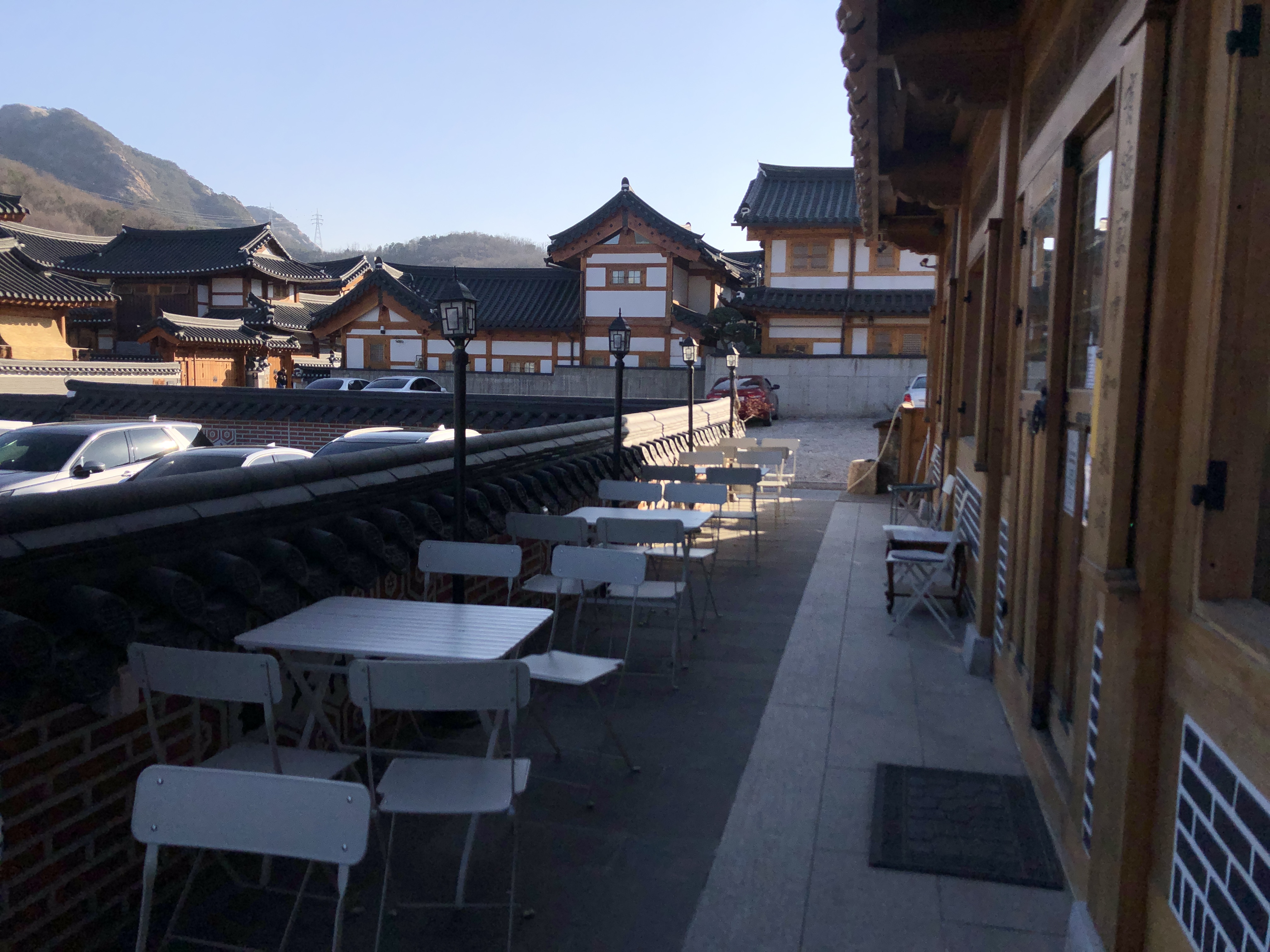 야외 테이블도 5개 정도 있었다. 아직은 밖에 앉기엔 조금 춥지만 봄에는 아주 인기 있는 자리가 될 것 같다. 한옥마을과 북한산 뷰를 감상하기 최적의 자리이다.