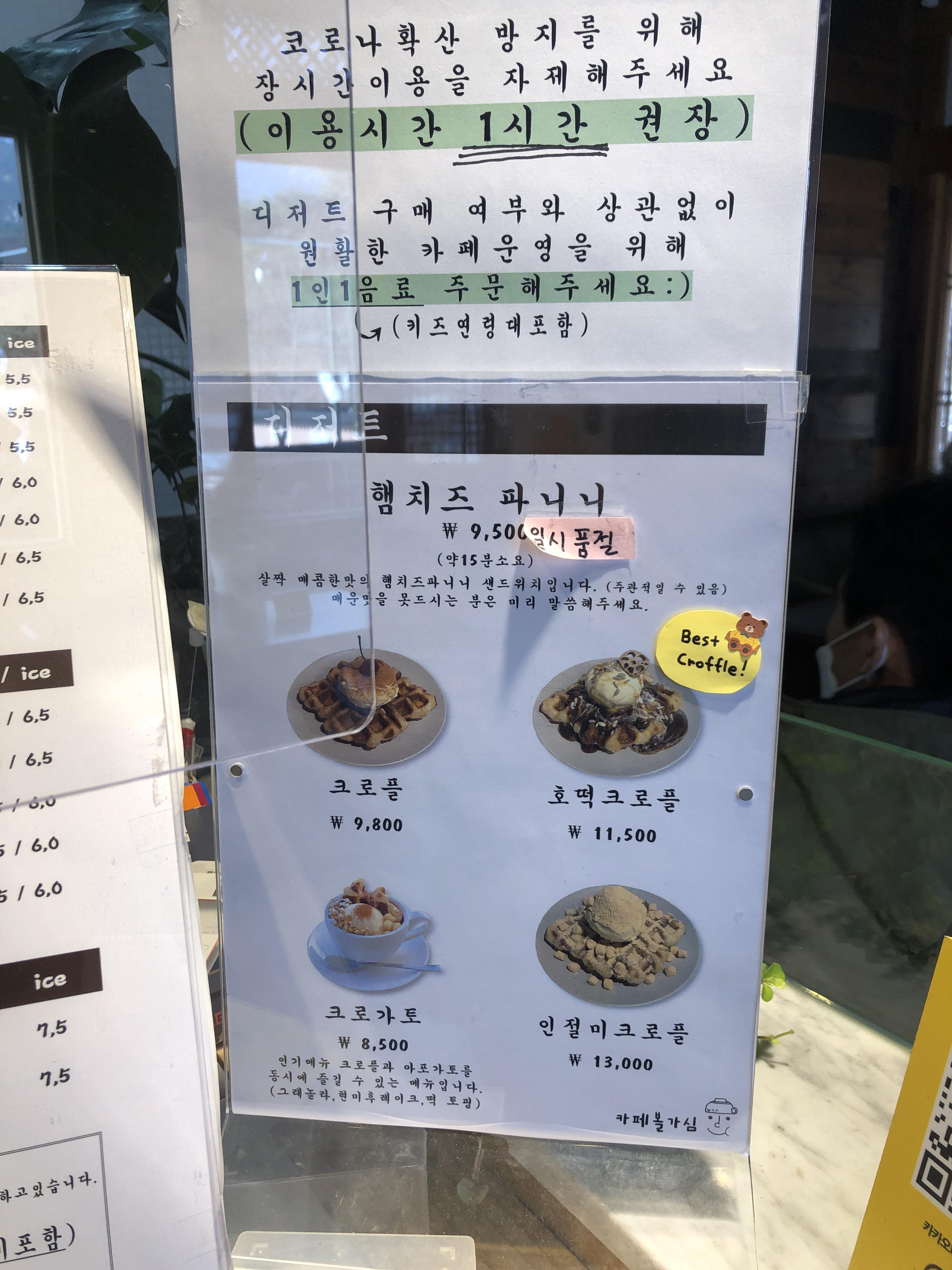 디저트 종류로는 크로플 메뉴와 파니니가 있었다. 가격은 사진을 참고하시면 된다. 주문을 하고 진동벨을 받아서 자리로 돌아왔다.