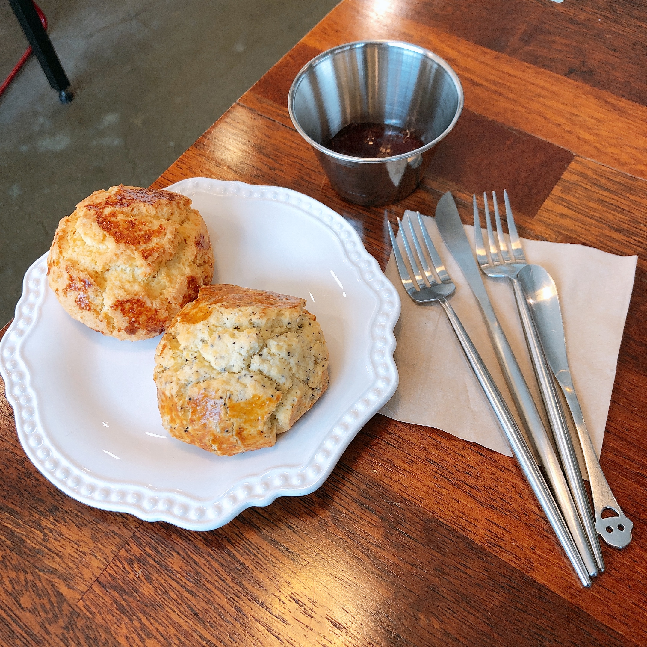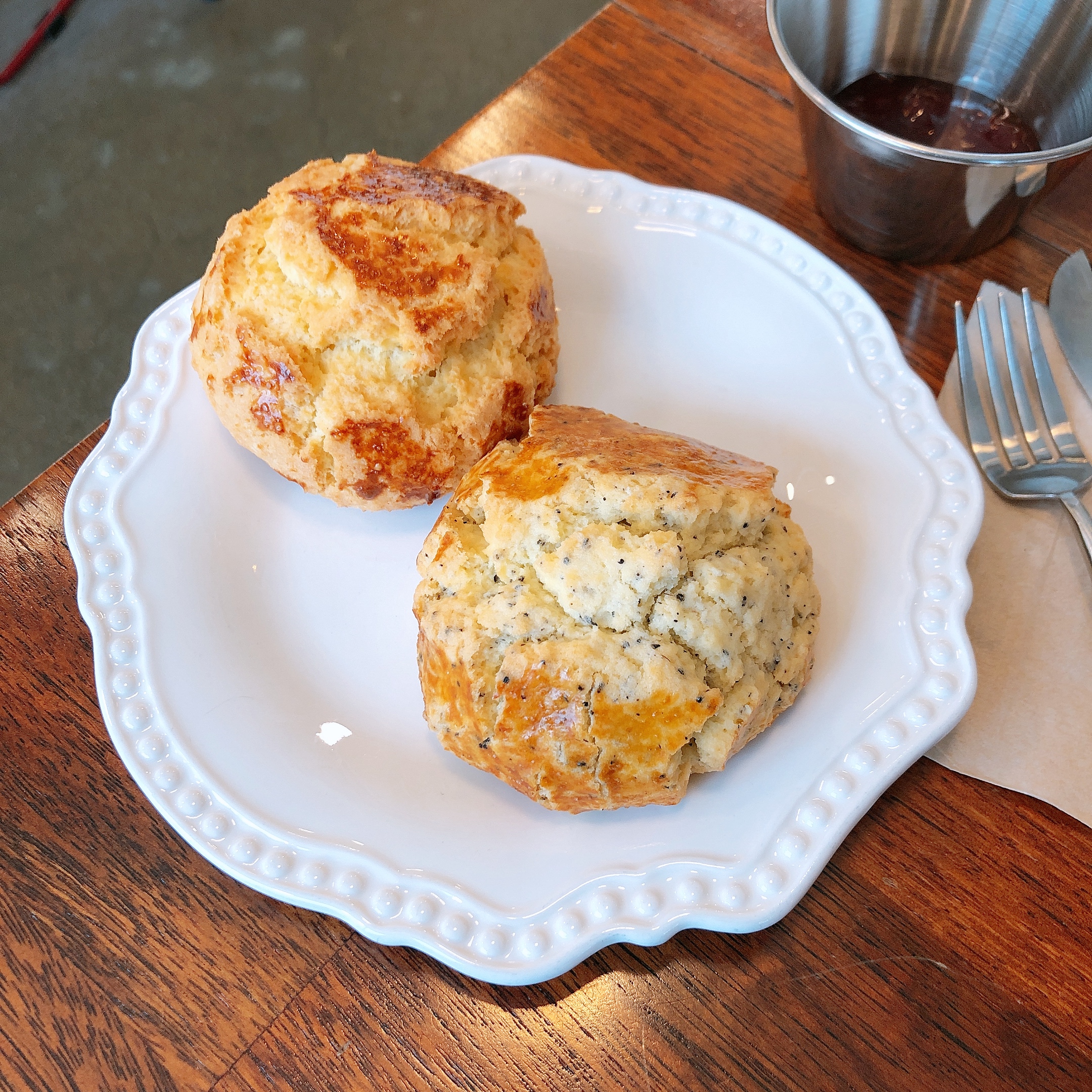 스콘 2개를 예쁜 접시에 담아주셨다. 까만 게 콕콕 박힌 스콘이 얼그레이 맛이다. 같이 먹을 딸기잼도 주셨다. 스콘 특유의 부스러짐 때문에 컷팅하니 산산조각이 나서 사진은 안 찍었다. 그렇지만 맛은 정말 좋았다. 촘촘하고 부슬부슬한 식감이 일품이고 고소한 버터향도 정말 좋았다. 여기에 달콤하고 상큼한 딸기잼을 발라먹으니 환상의 조합이었다.