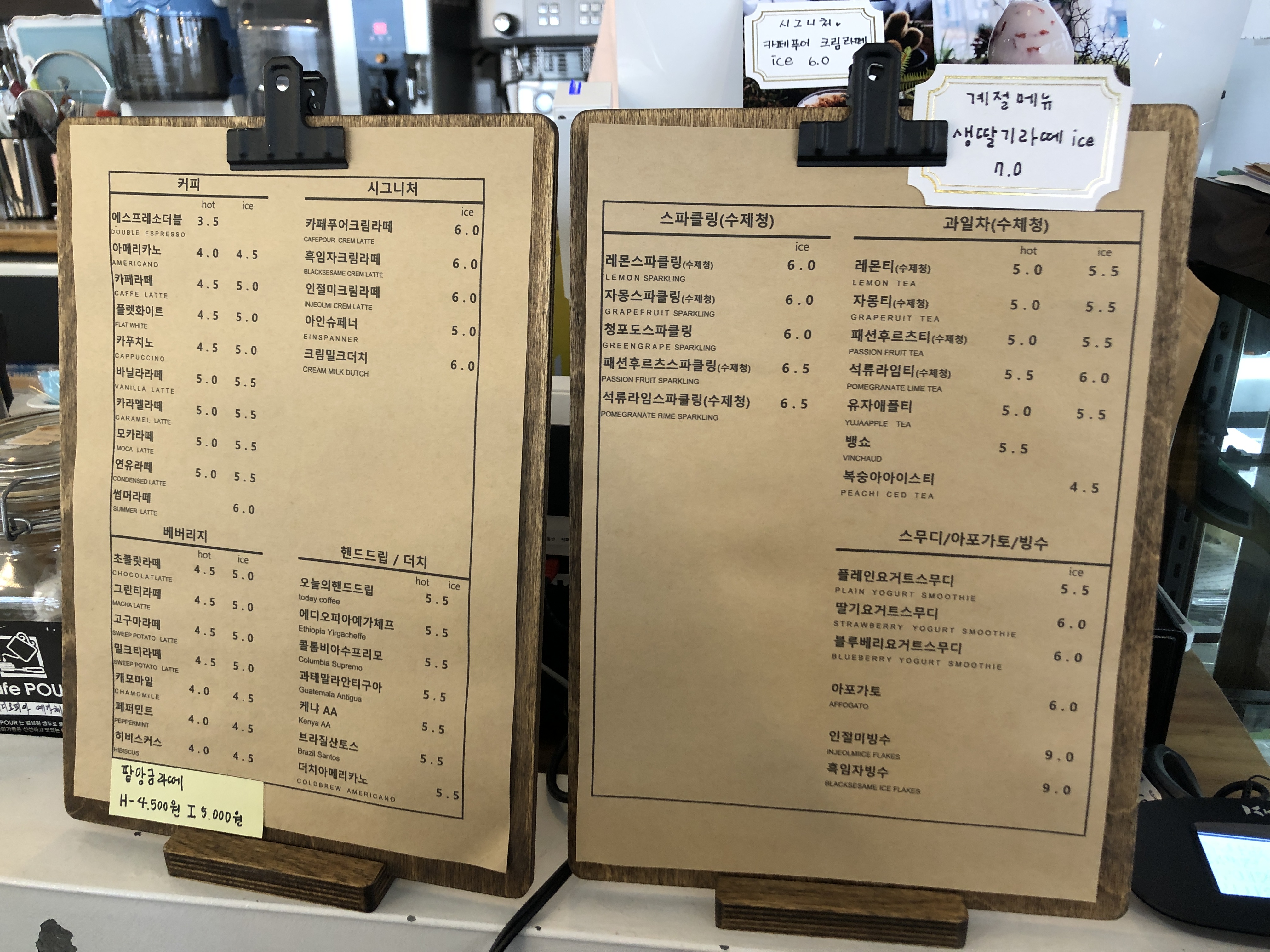 카페푸어에서 판매되는 음료 메뉴판이다. 에스프레소, 핸드드립 커피, 더치커피, 티라떼, 스파클링 음료, 과일차, 스무디, 아포가토, 빙수 등 다양한 메뉴가 있었다. #카페푸어가격