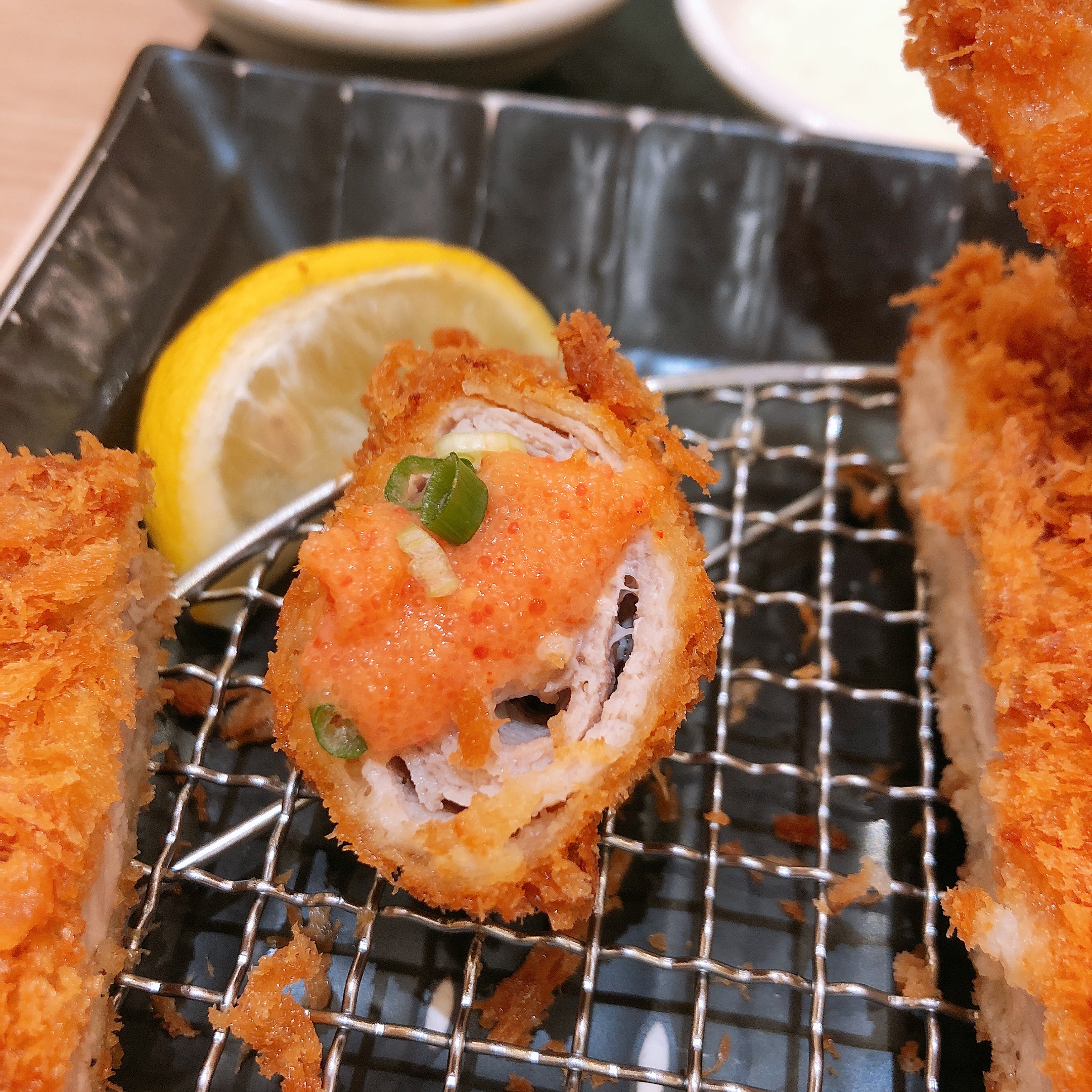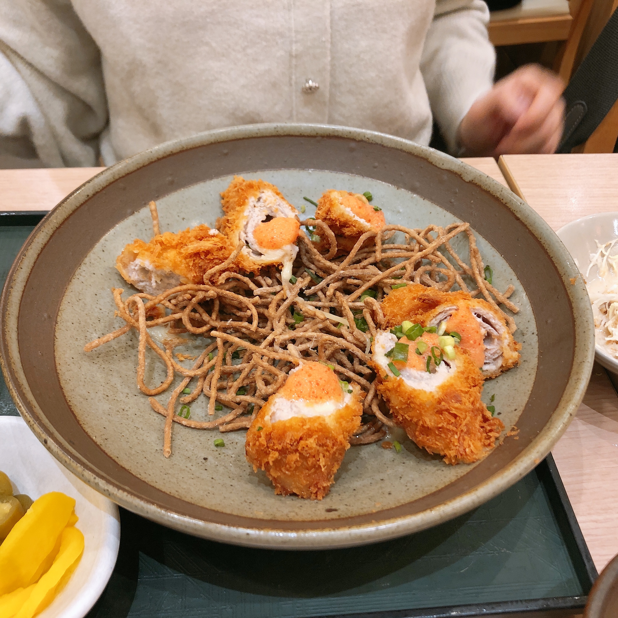 스페셜 카츠 정식 중 대표 메뉴인 '명란 치즈 카츠'이다. 먹다가 생각나서 급하게 사진을 찍어서 모양은 조금 흐트러졌다. 치즈 롤 카츠 위에 명란 소스가 올라가 있다. 카츠 밑에 깔린 것은 소바면을 튀긴 것이라고 한다. 소바면 튀긴 것은 데코도 되고 맛도 좋았다.