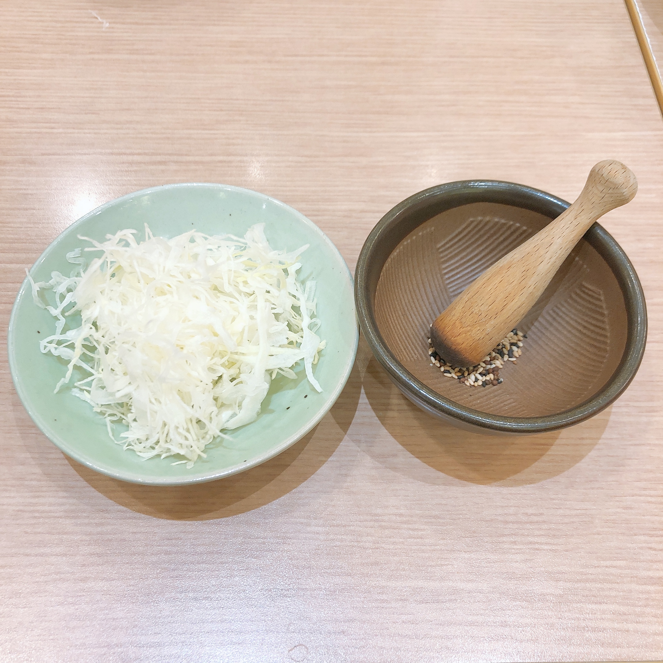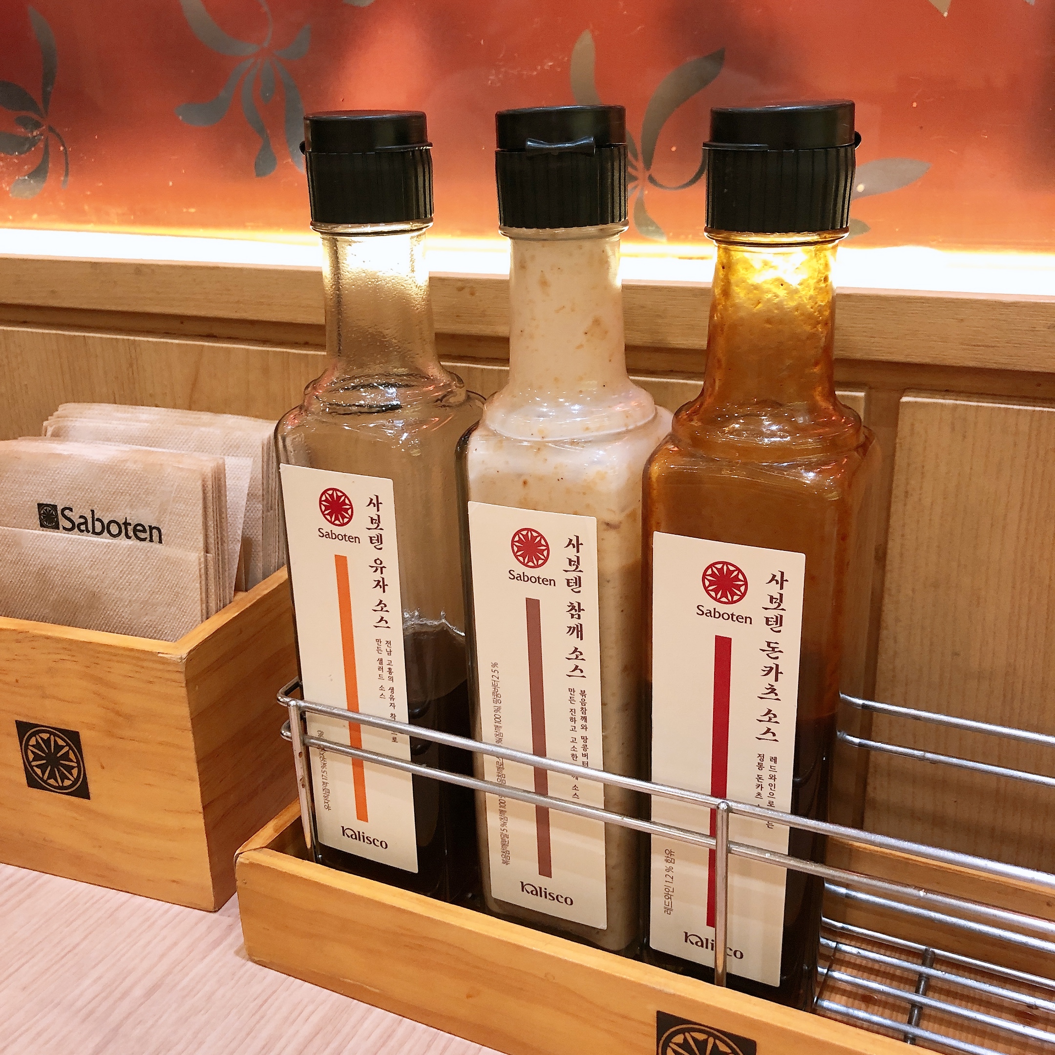 자리에 샐러드 소스 2종(유자소스, 참깨소스), 돈카츠 소스가 준비되어 있었다.