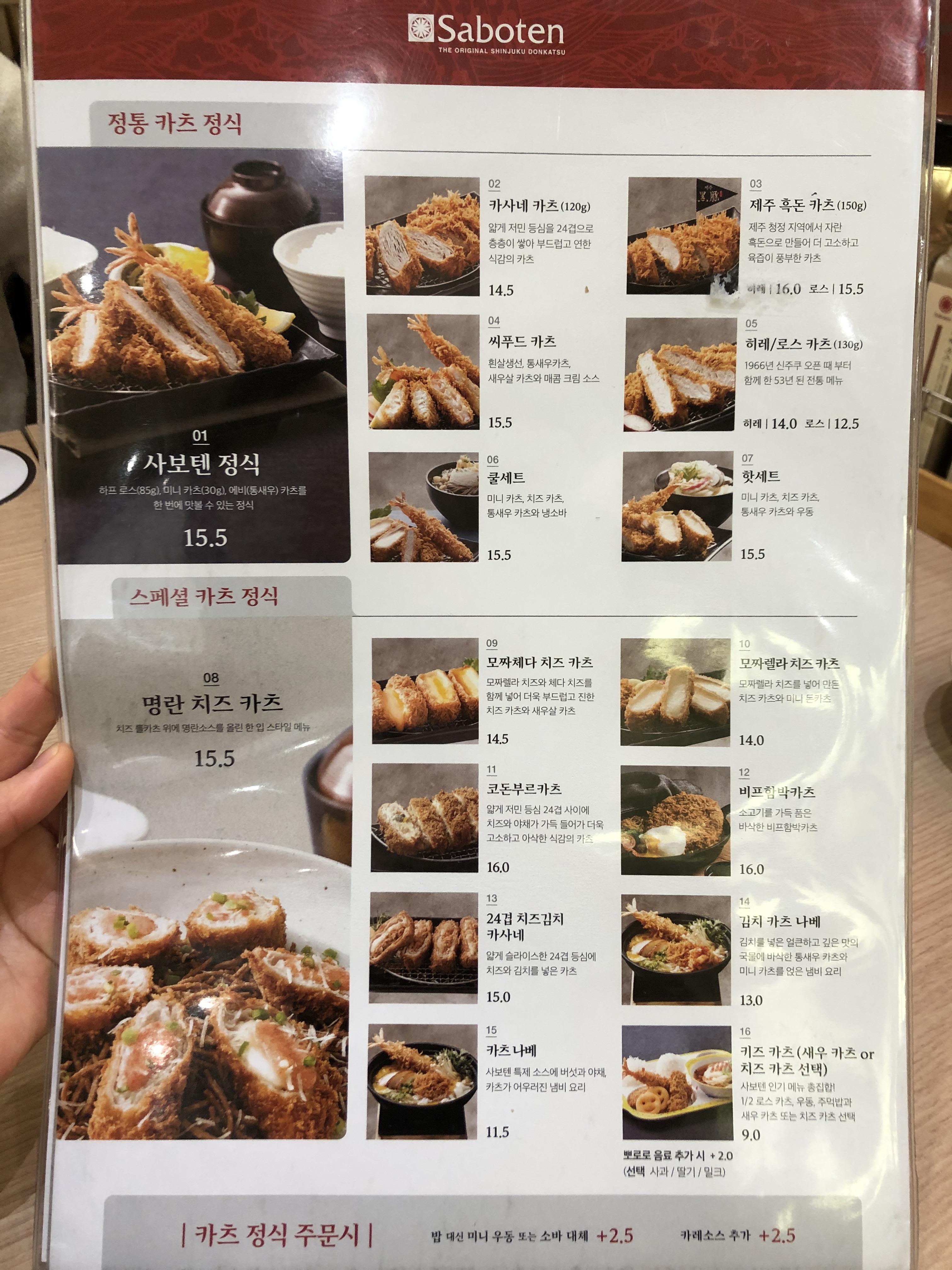주말이었지만 대기 없이 착석할 수 있었다. 자리에 앉자마자 사보텐 메뉴판을 훑어보았다. 사진에는 돈카츠 메뉴밖에 없지만 실제로는 덮밥과 우동, 소바 메뉴도 있었다. 사보텐 가격은 솔직히 비싼 편이다. #사보텐가격 #사보텐돈까스 #사보텐메뉴추천