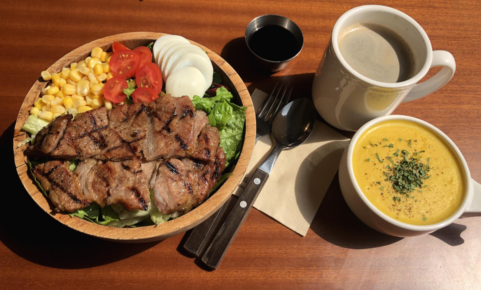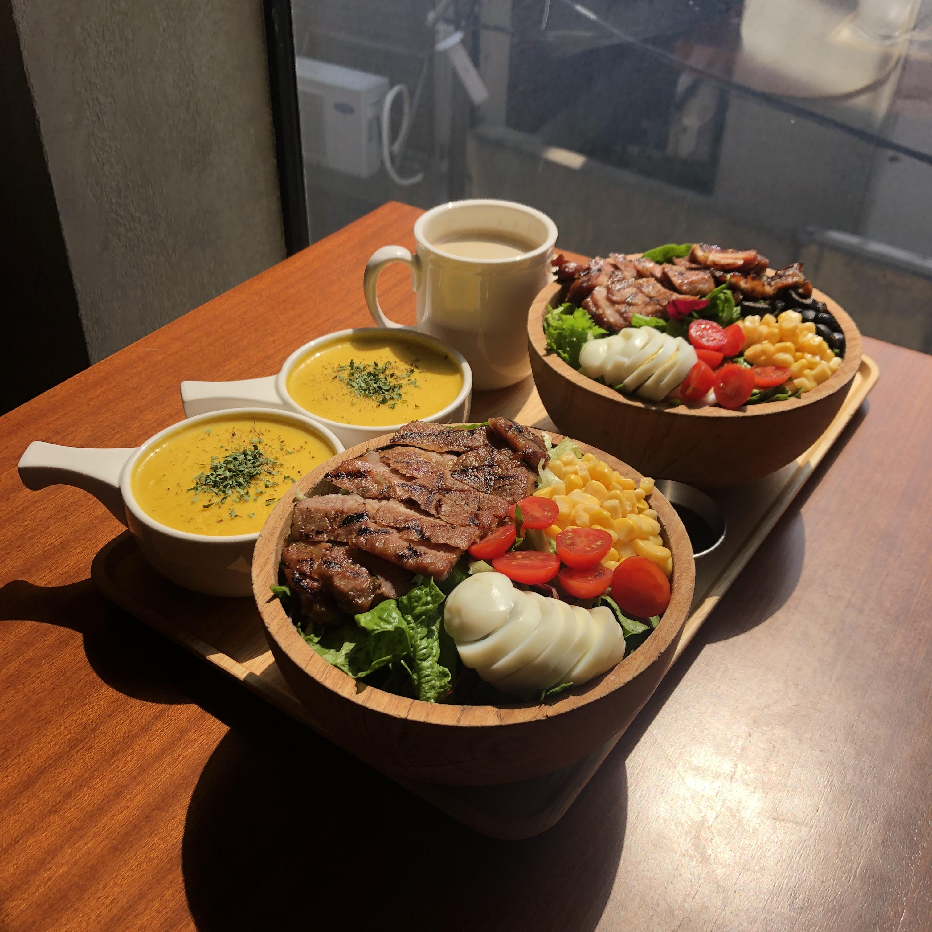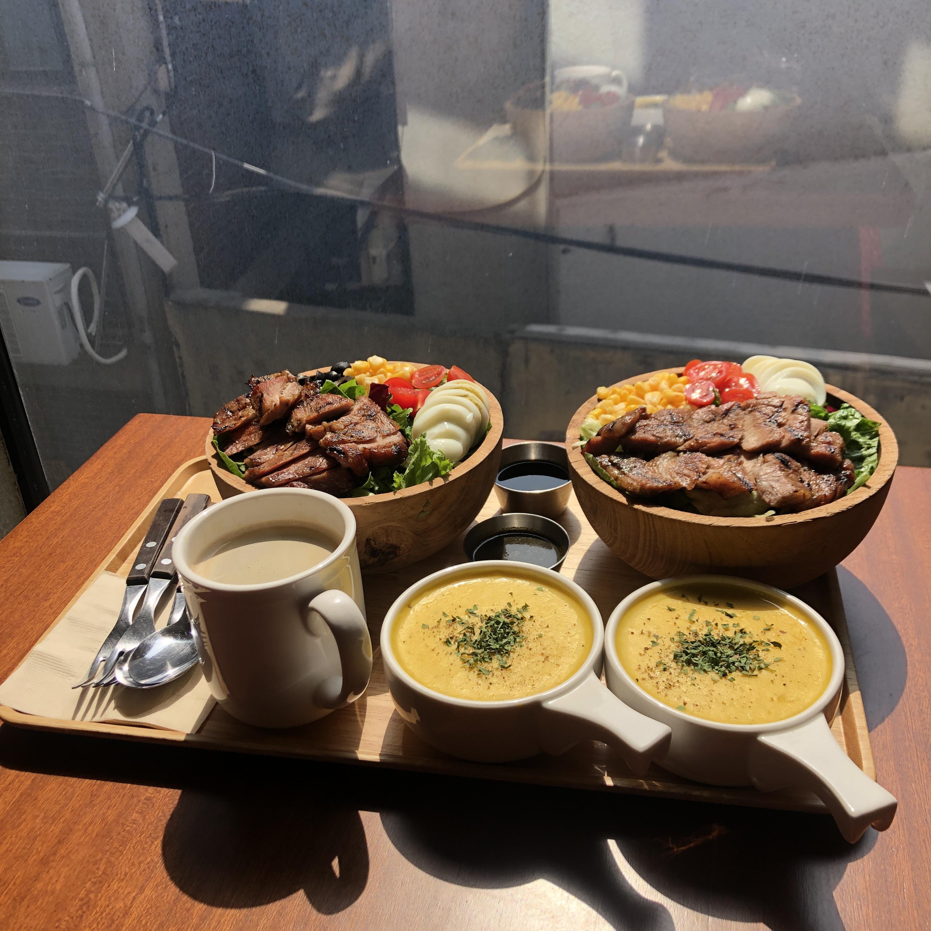 짠!!! 저희는 목살 스테이크 샐러드 2개와 수제 단호박 수프 2개, 아메리카노를 주문하였습니다. 색감이 너무 예쁘고 양도 푸짐했습니다. 우드볼과 우드 포크와 숟가락, 수프 그릇도 참 예쁘더라고요. 먹기 전부터 매우 기분이 좋았습니다.