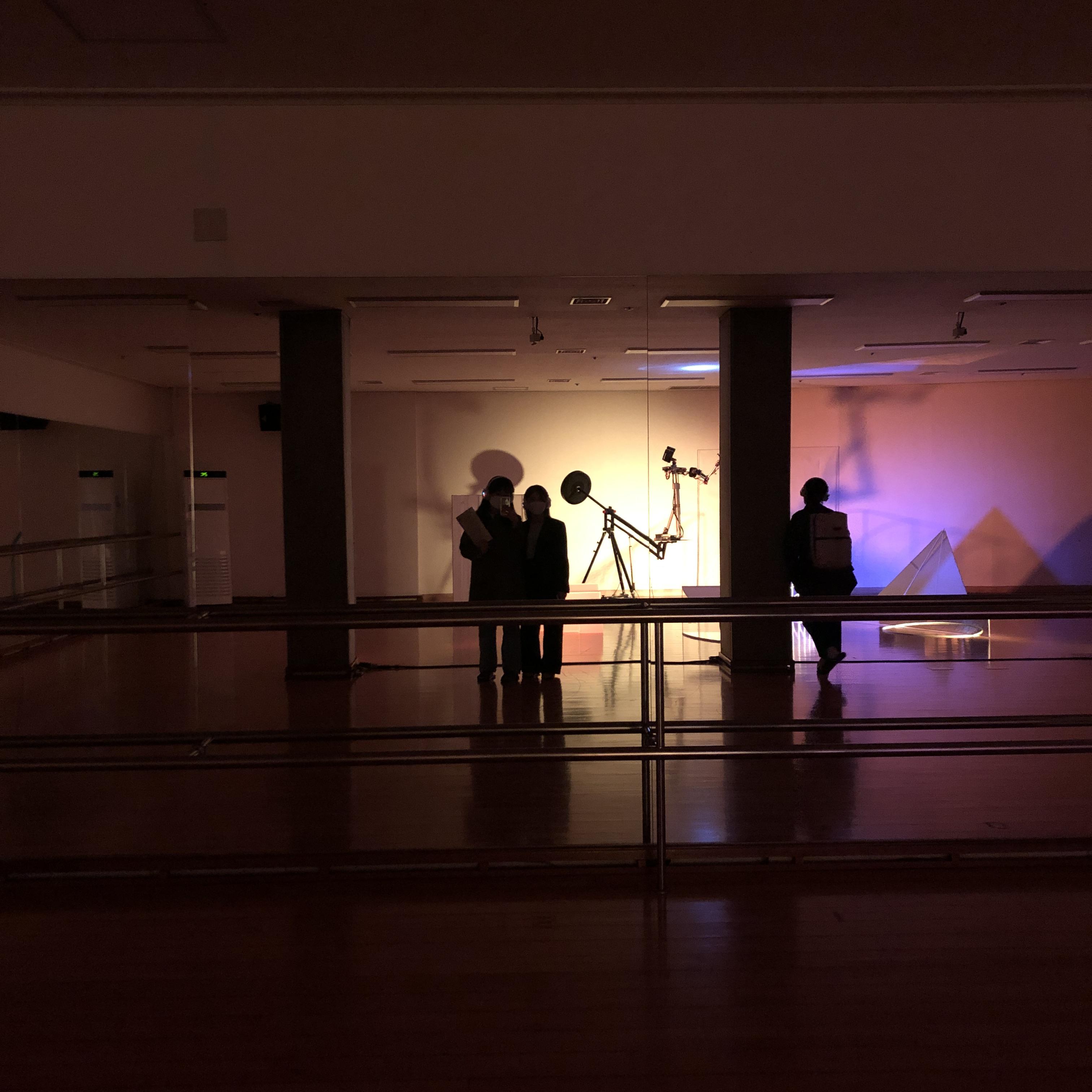 어두운 지하 연습실에는 <비정형의 문들>이라는 주제의 공간 설치 작품이 전시되어 있습니다. 화려한 조명으로 매우 집중이 되며 로봇의 기이한 움직임과 소리때문에 긴장감이 있었습니다.